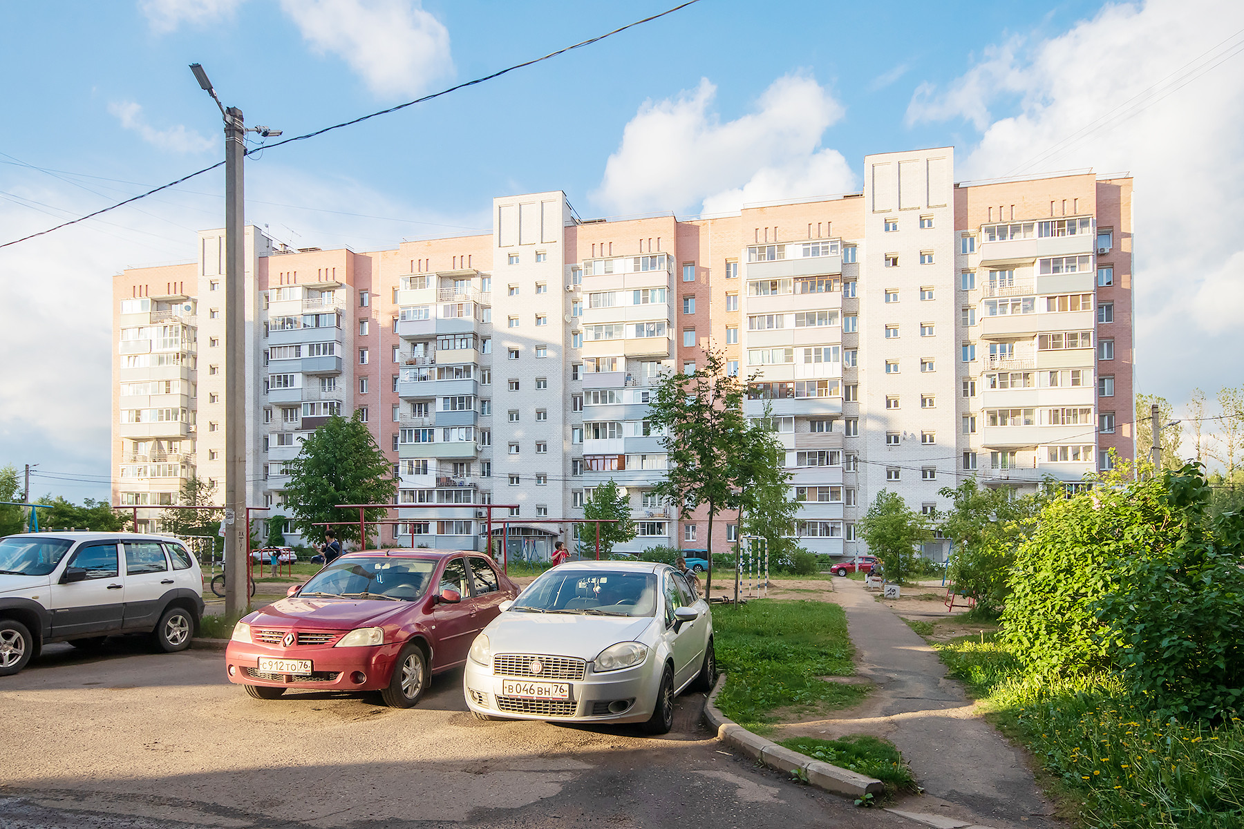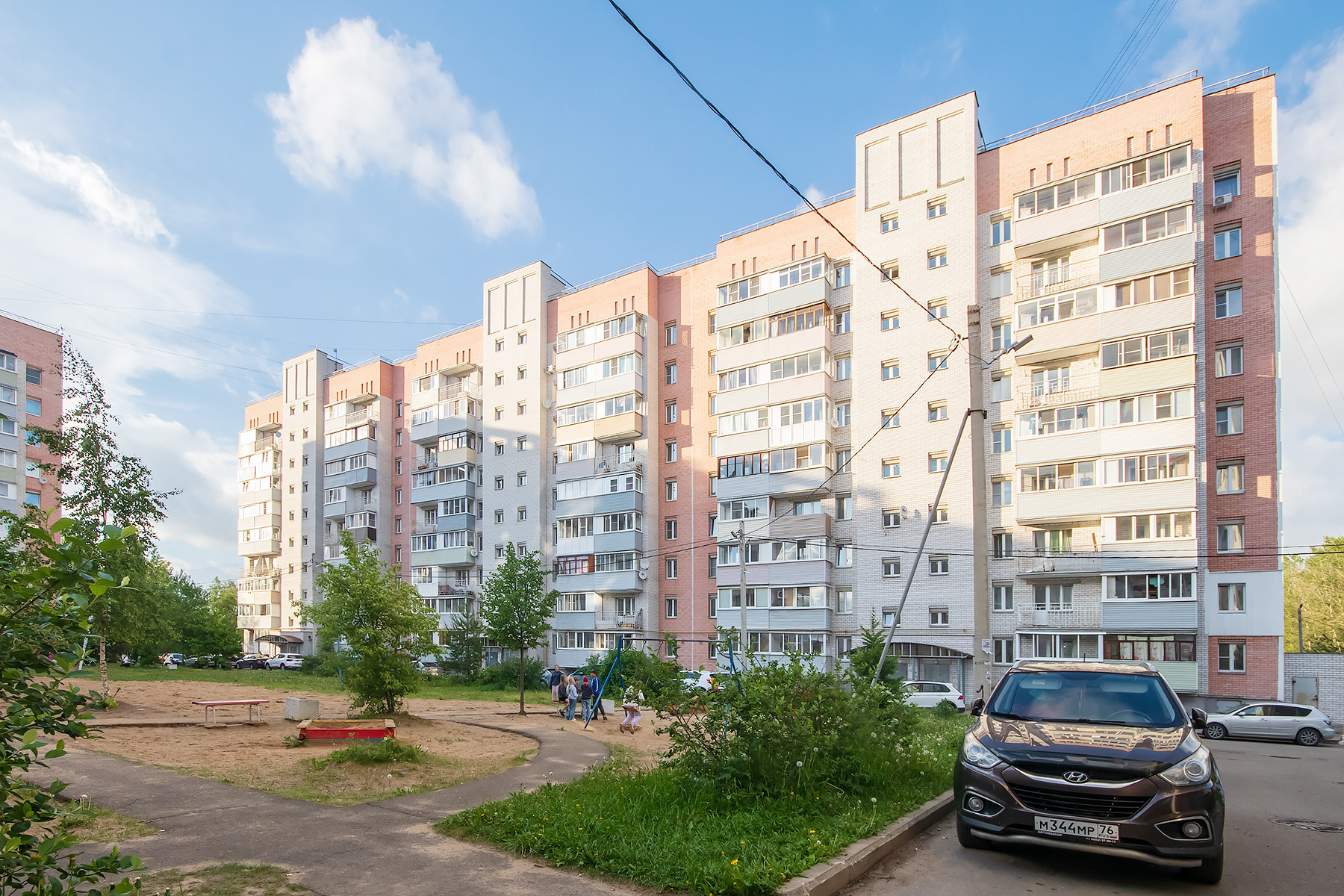 Территория вокруг дома обустроена. Оборудована детская площадка. Выполнено озеленение,