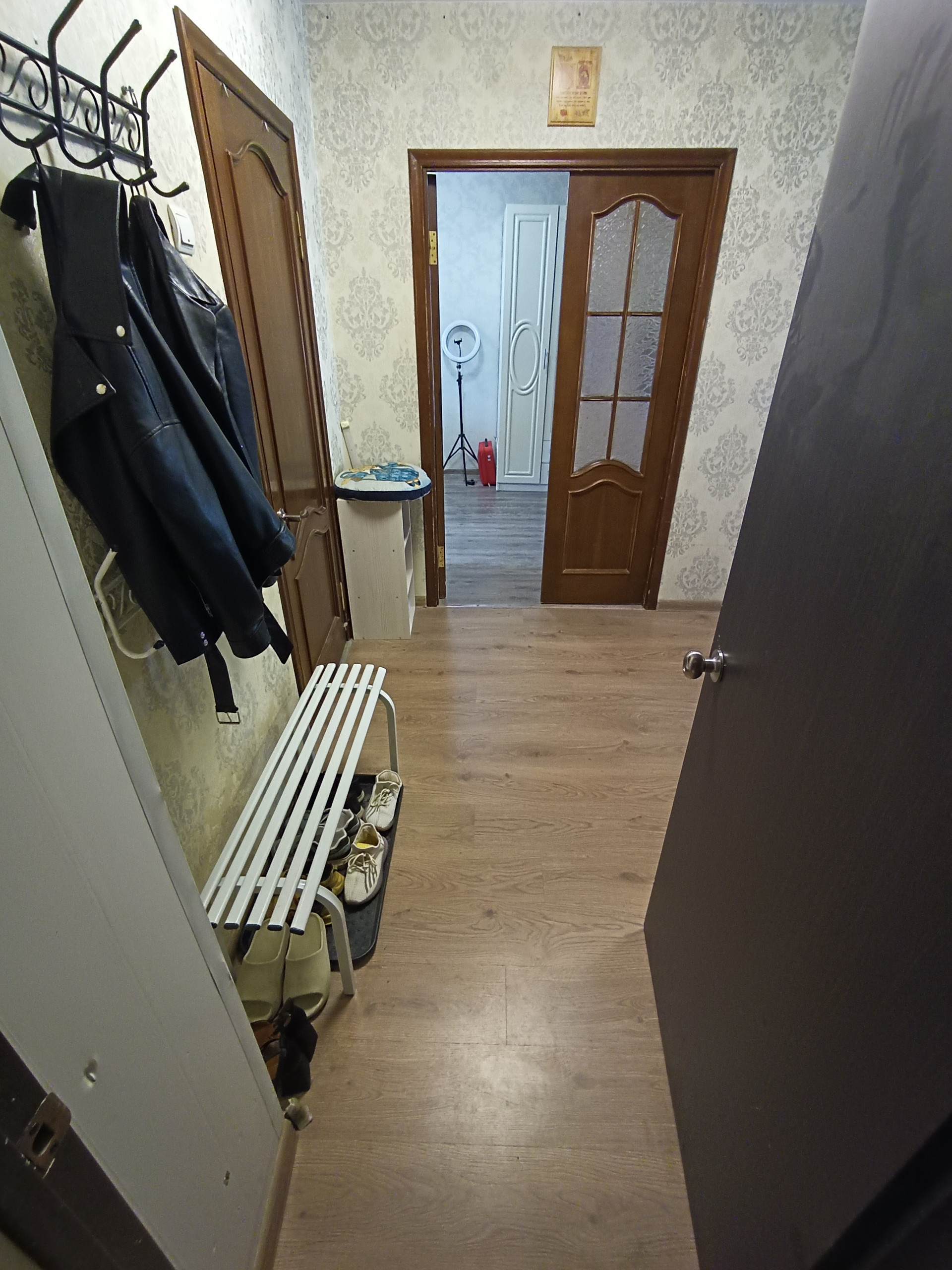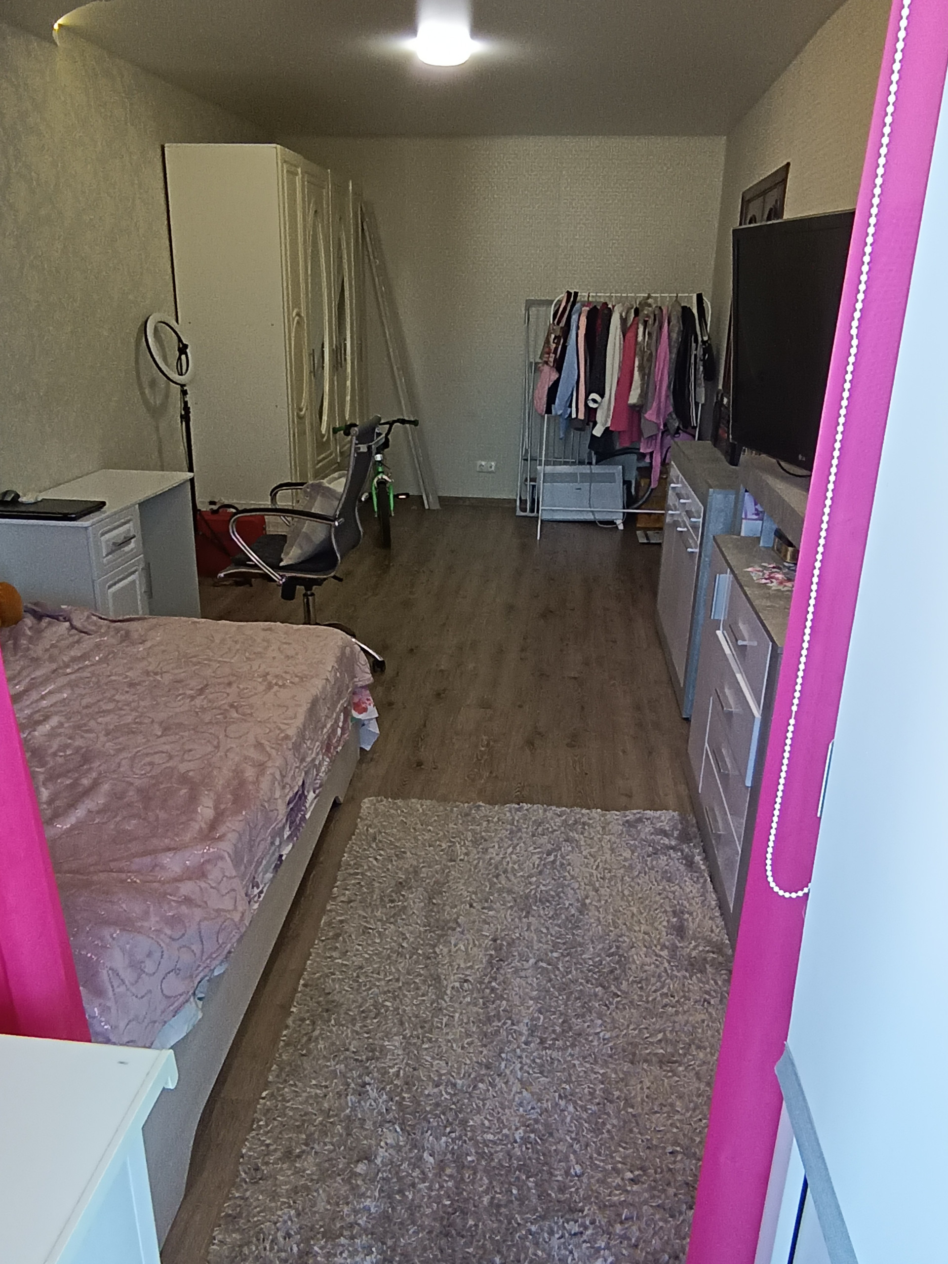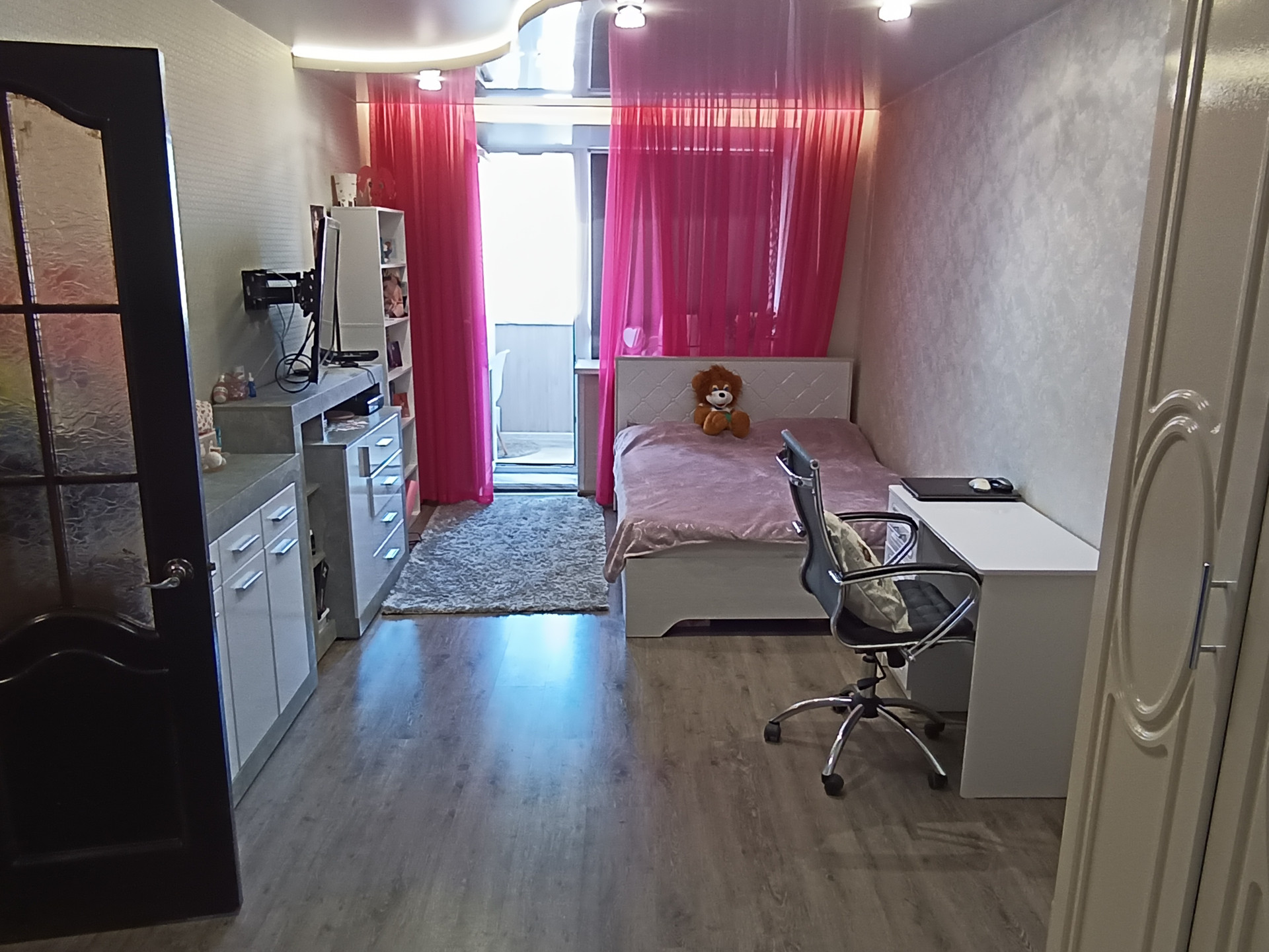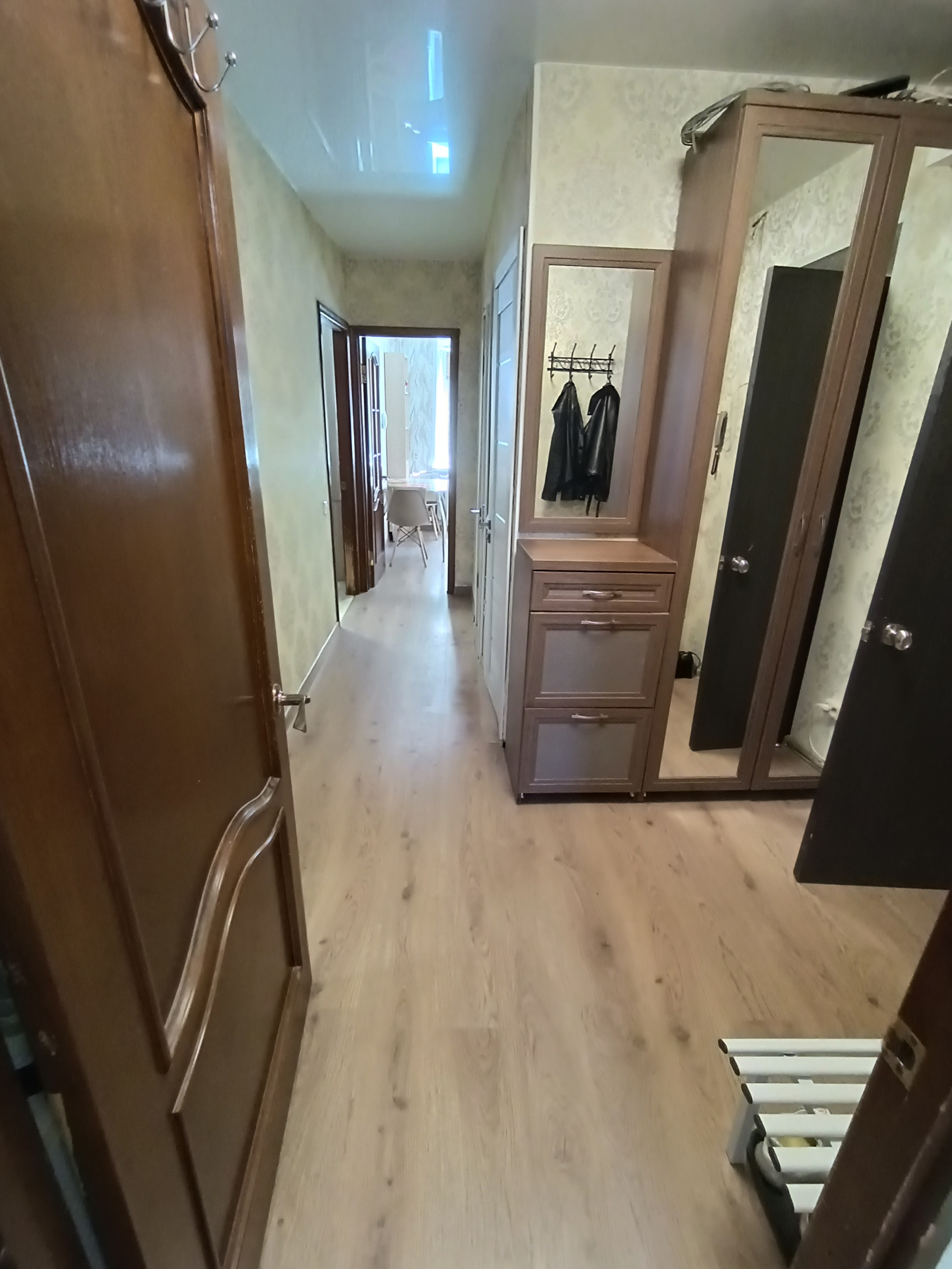 Новые натяжные потолки (матовый и глянцевые) во всей квартире. В одной комнате линолеум, в других - ламинат.