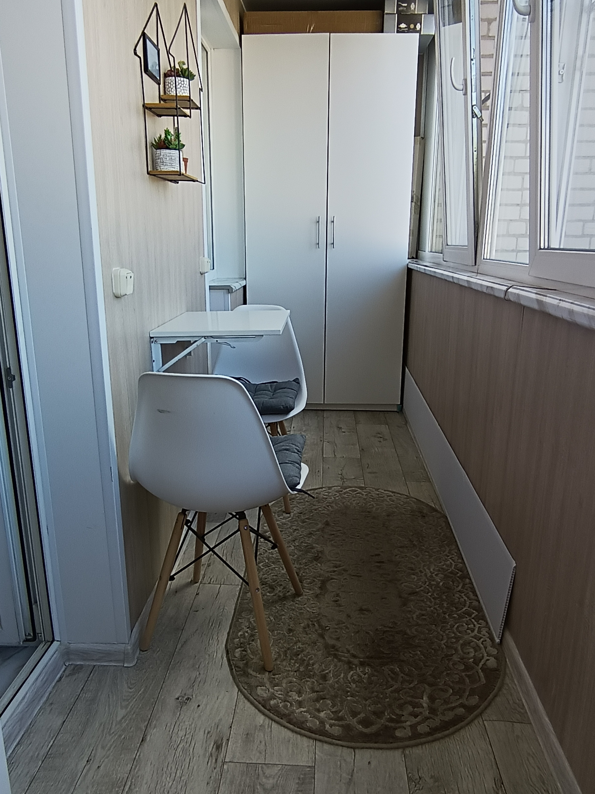 В отремонтированной и утеплённой лоджии (6 кв.м) есть свет, розетки, остаётся шкаф и кресло-кровать.