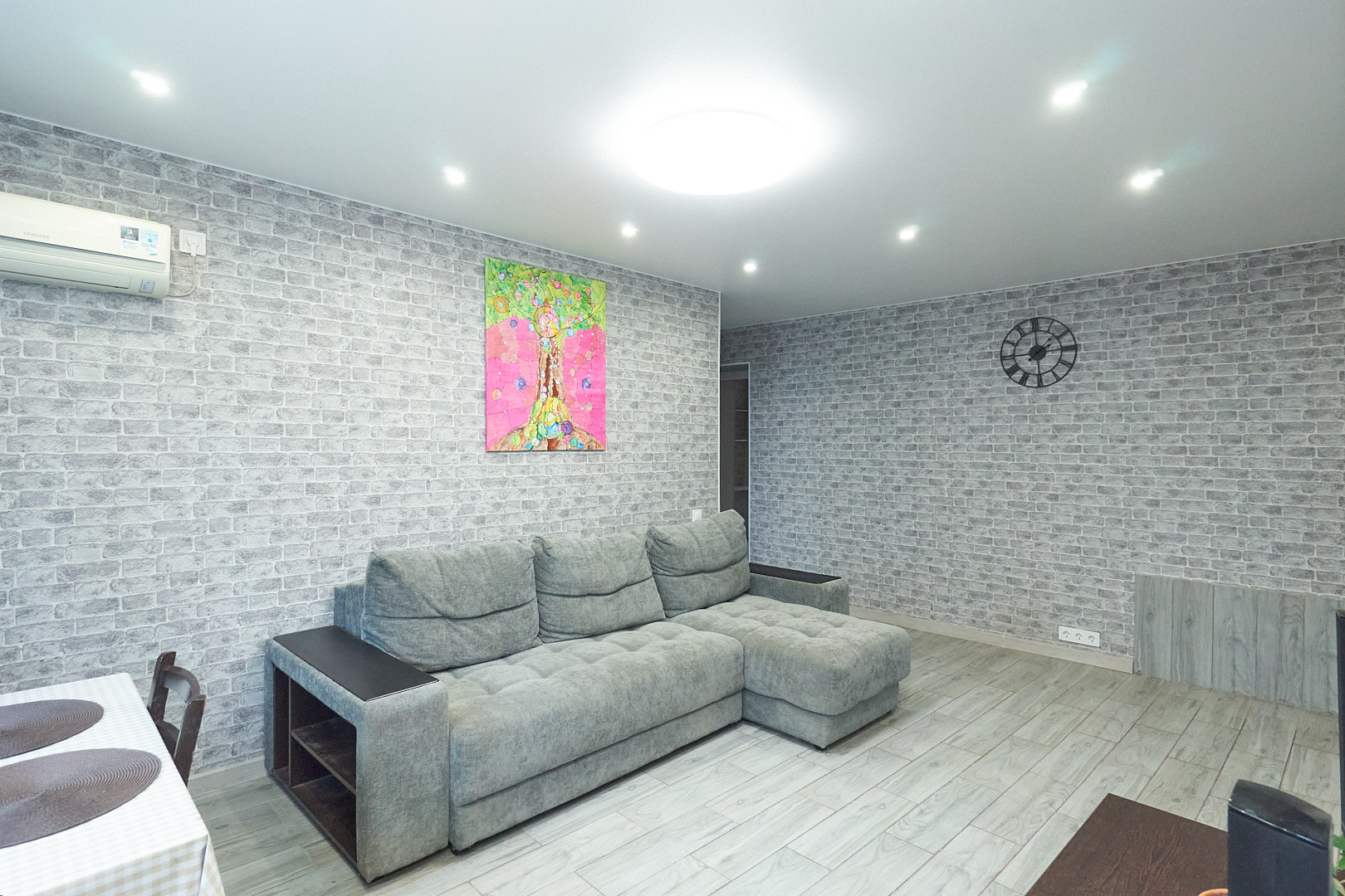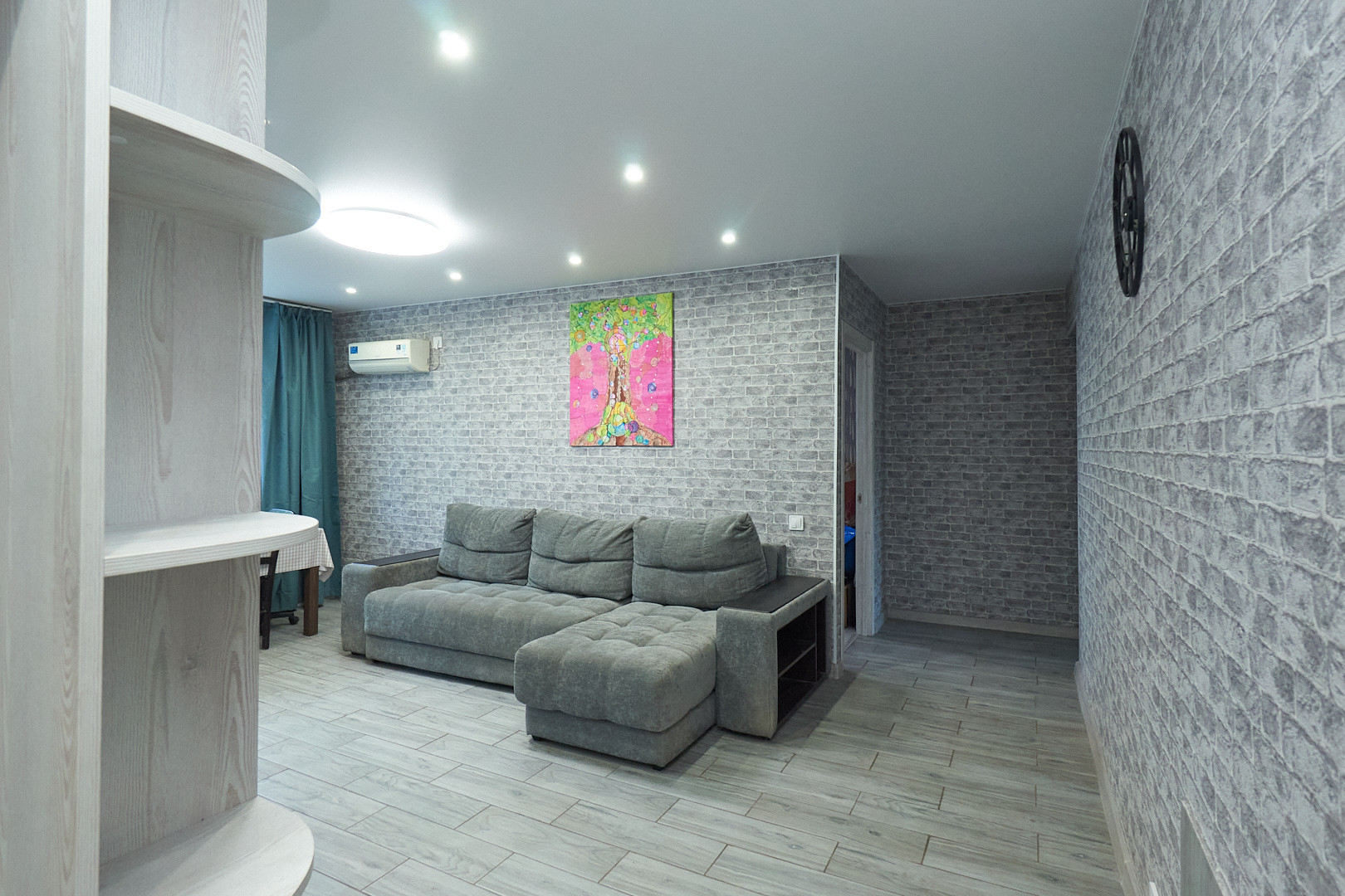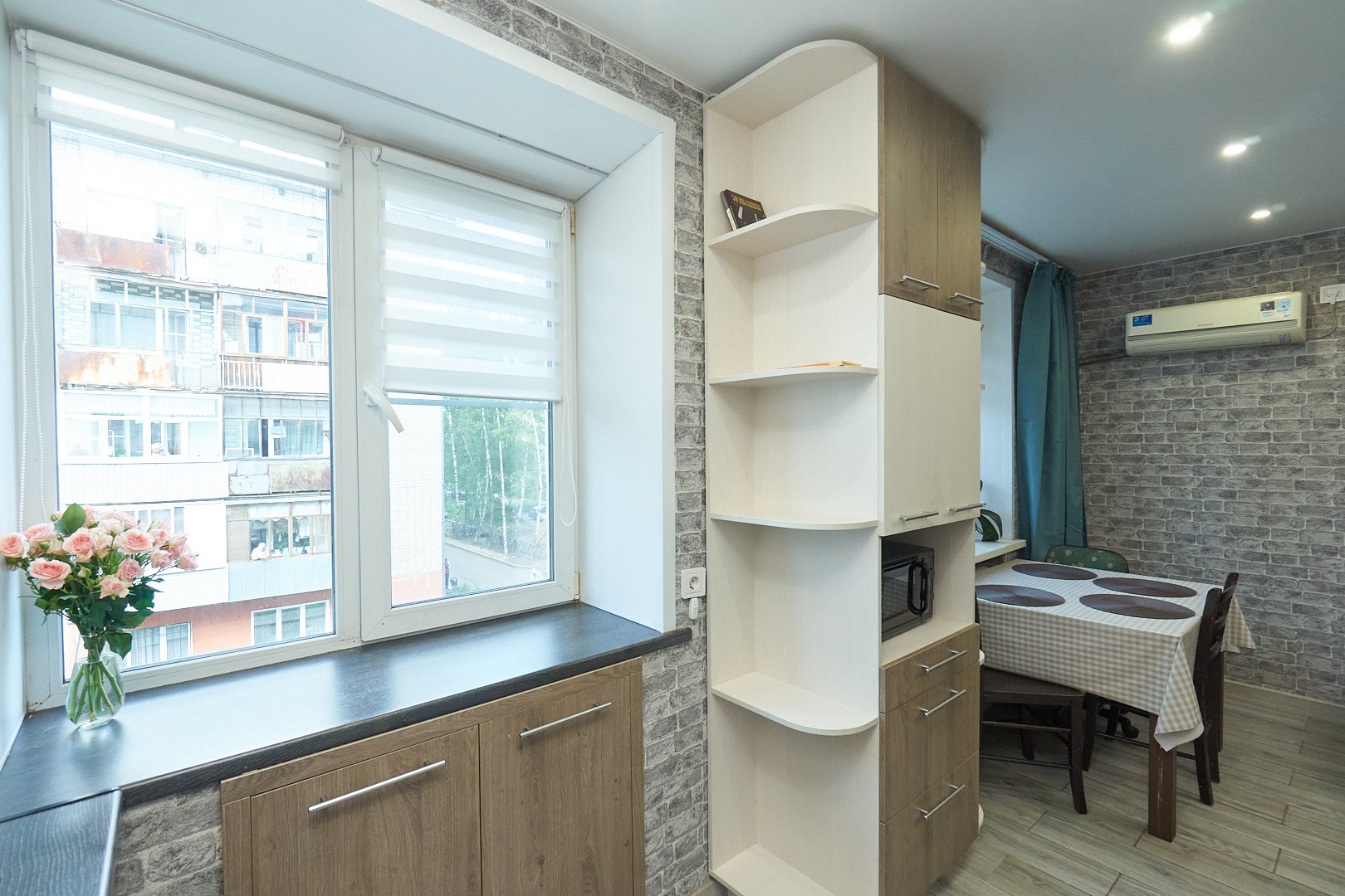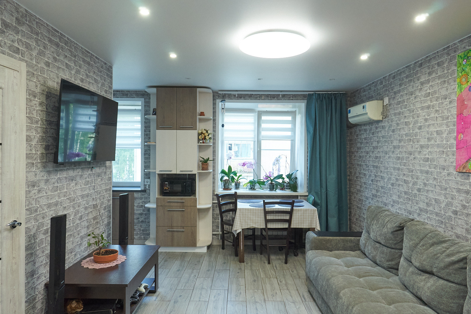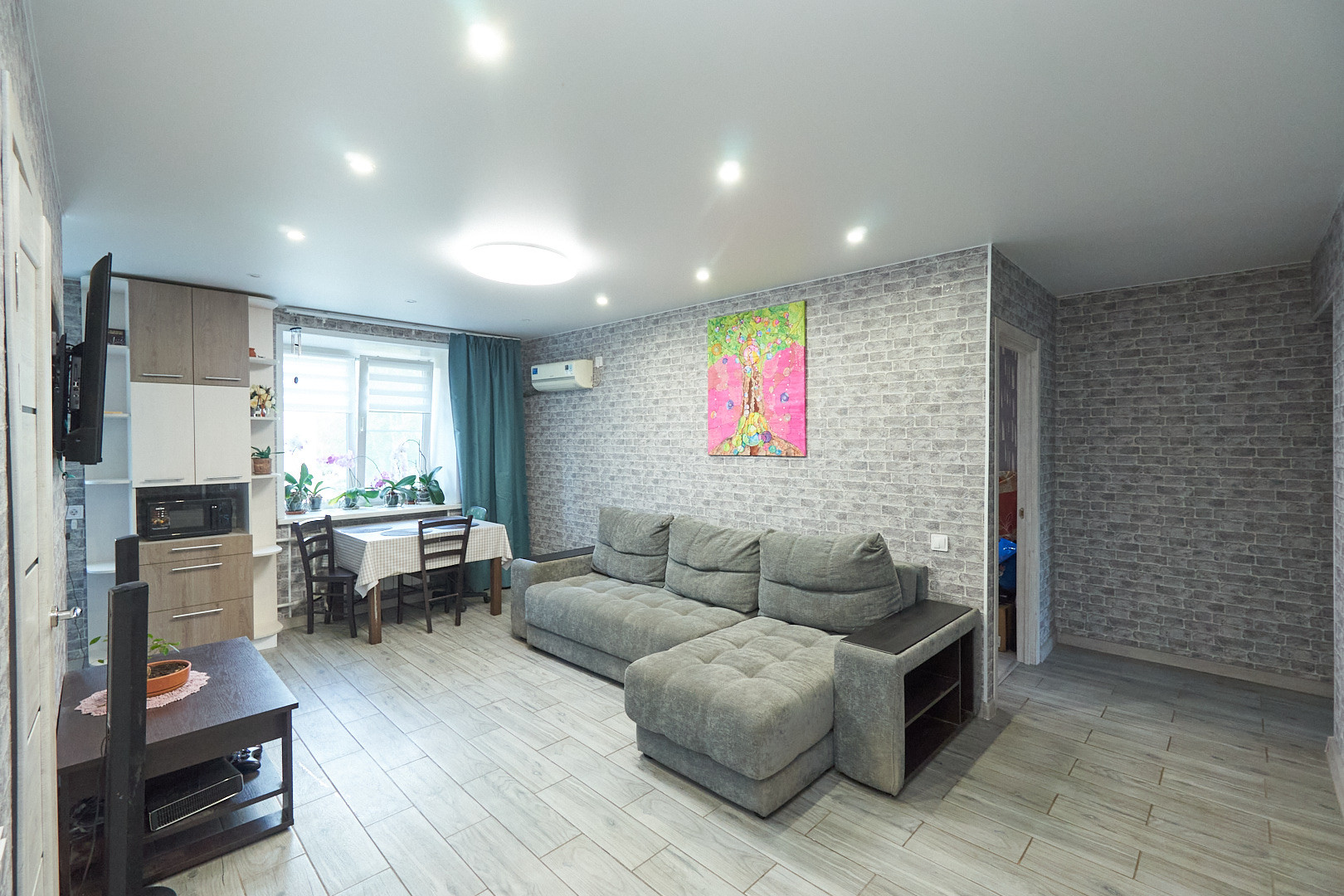 Для комфортного проживания установлен кондиционер, остаётся кухонный гарнитур со встроенной техникой.