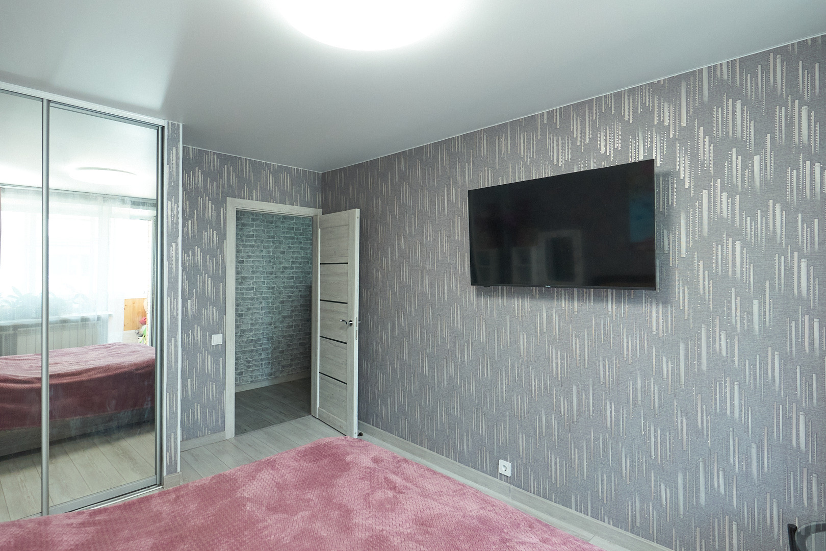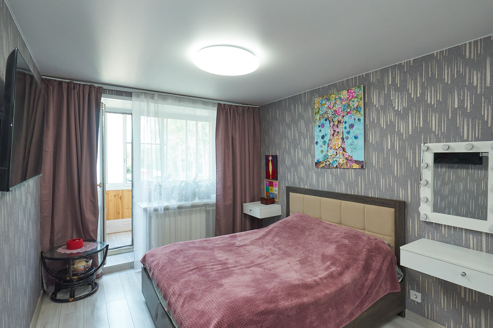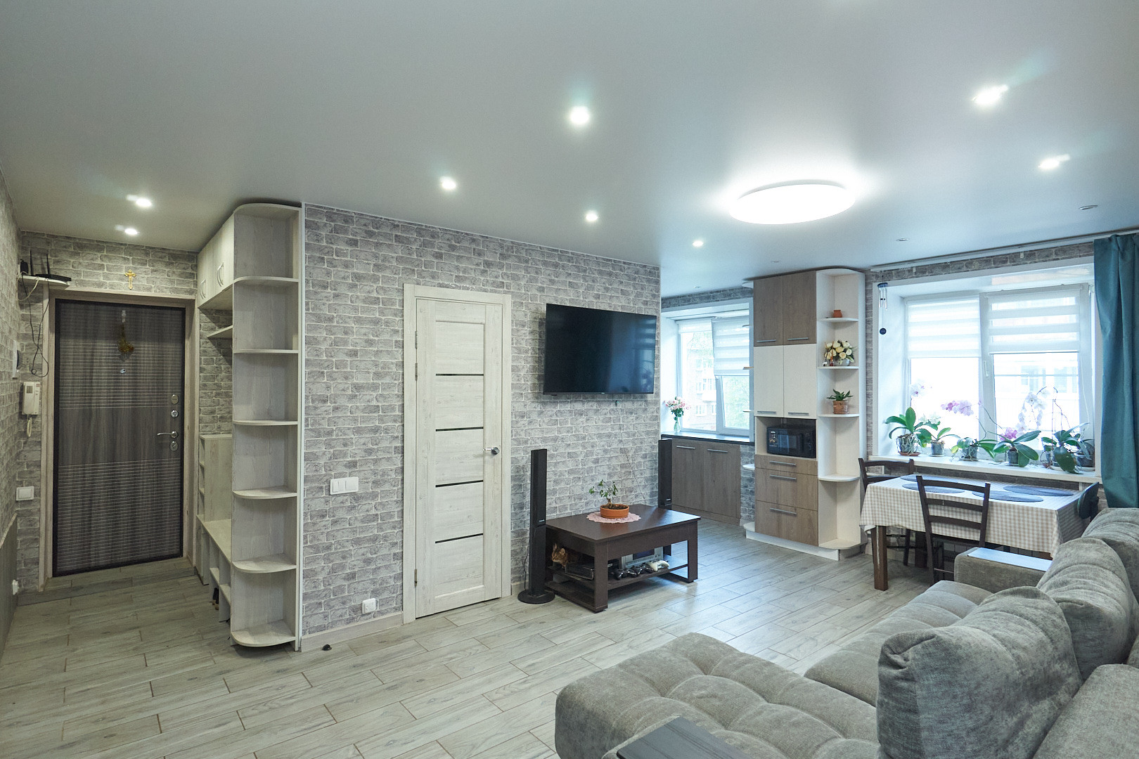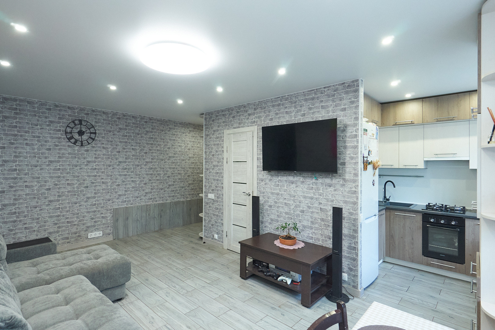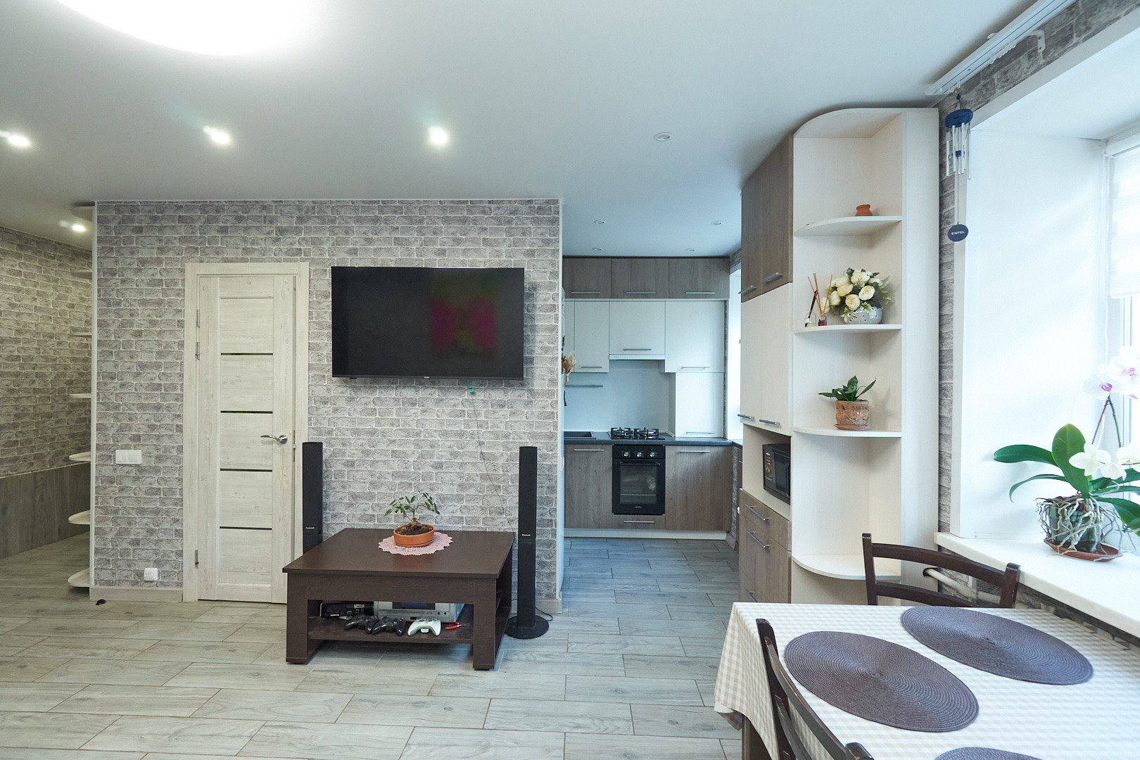 Для комфортного проживания установлен кондиционер, остаётся кухонный гарнитур со встроенной техникой.