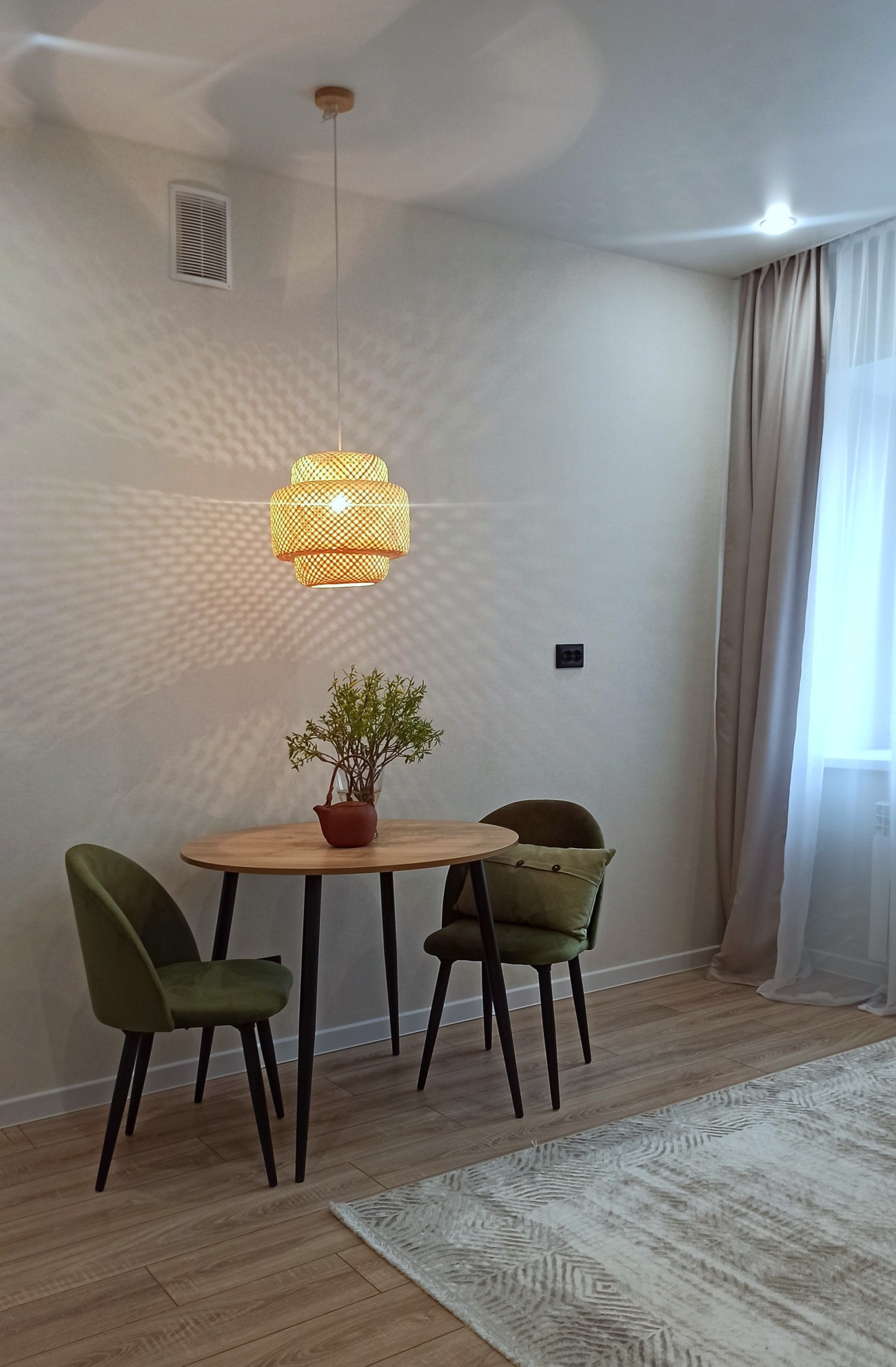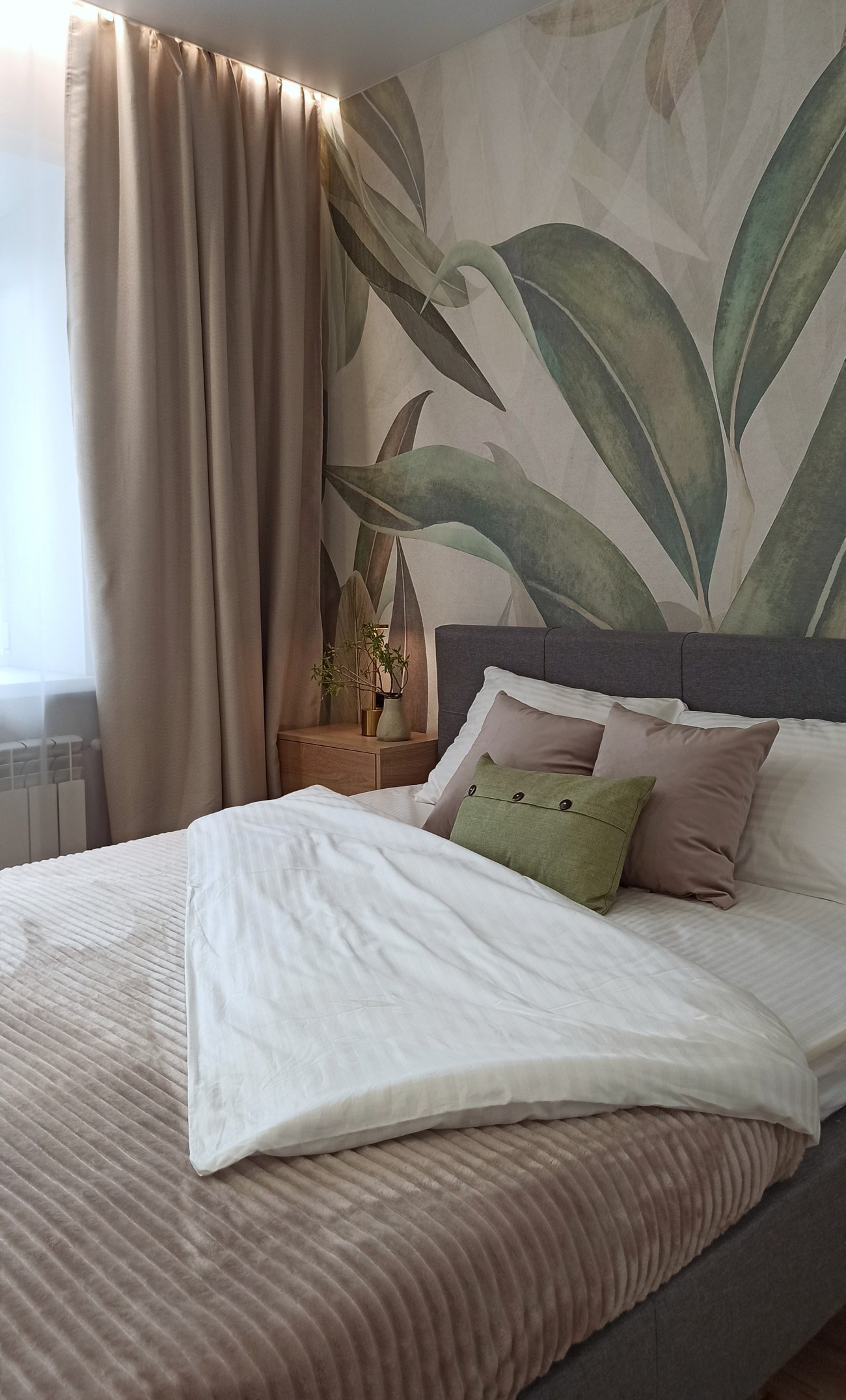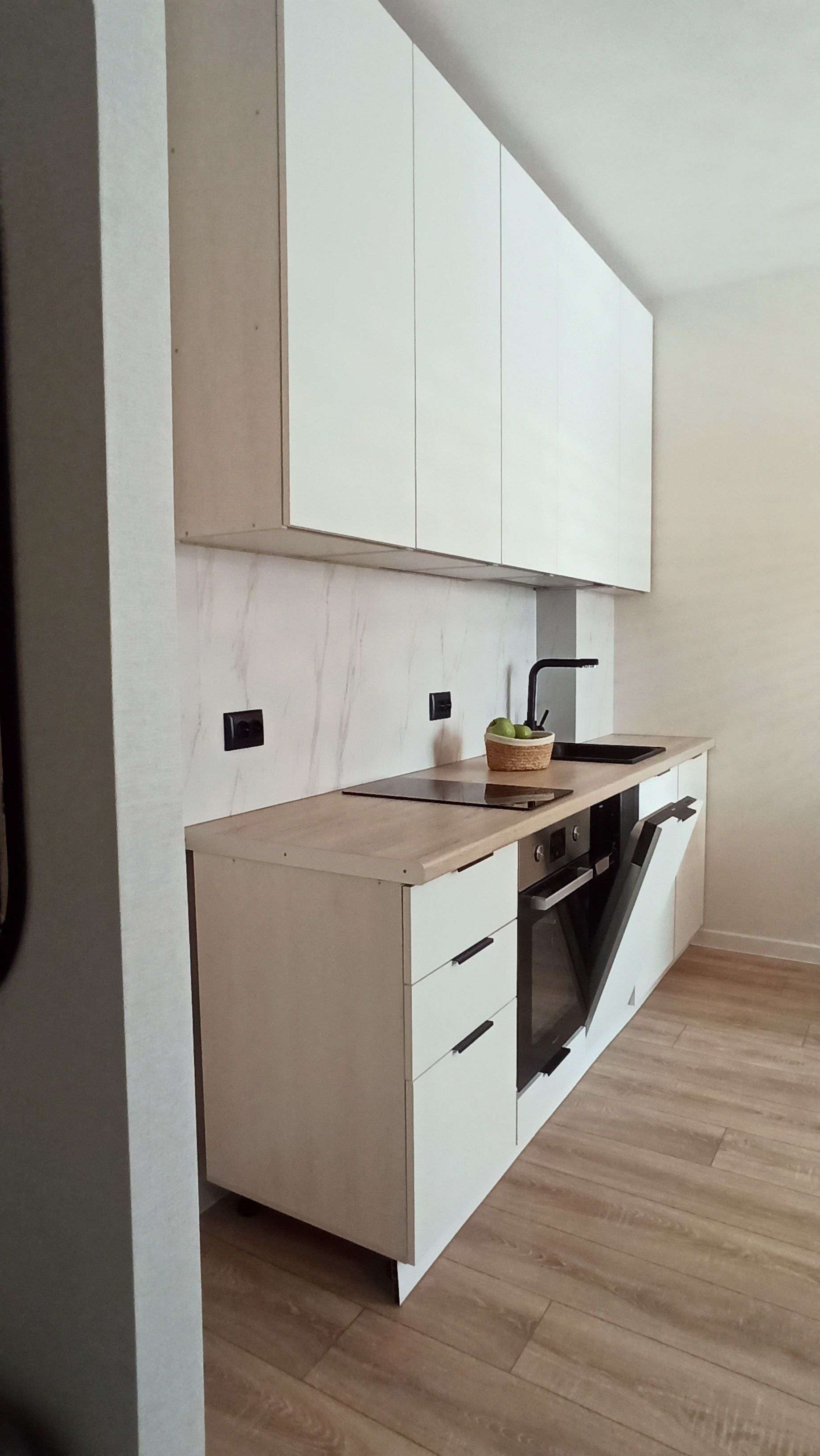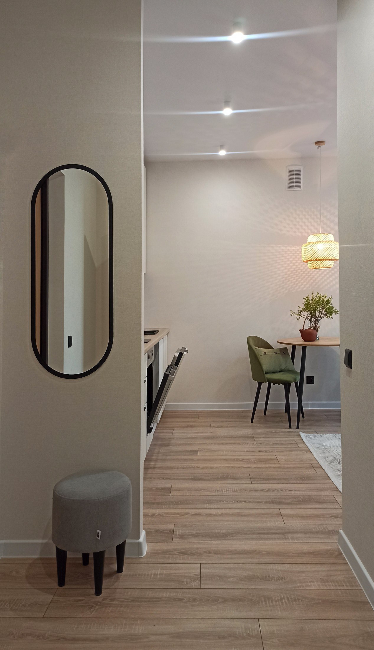 В квартире сделан ремонт: заменены коммуникации (электрика, трубы сантехники), новая качественная сантехника, несколько сценариев освещения, стены оклеены обоями, ламинат 33 класса. Встроенный кухонный гарнитур, выполненный под заказ: посудомоечная машина, варочная панель, духовой шкаф, мойка из искусственного камня, подсветка, доводчики. Предусмотрено место под холодильник. Обеденный стол с мягкими стульями. Раскладной диван. Двухспальная кровать 160*200 с ортопедическим матрасом, большой шкаф, гардеробная. В спальне также по желанию можно выделить рабочую зону, для этих целей предусмотрен стол.