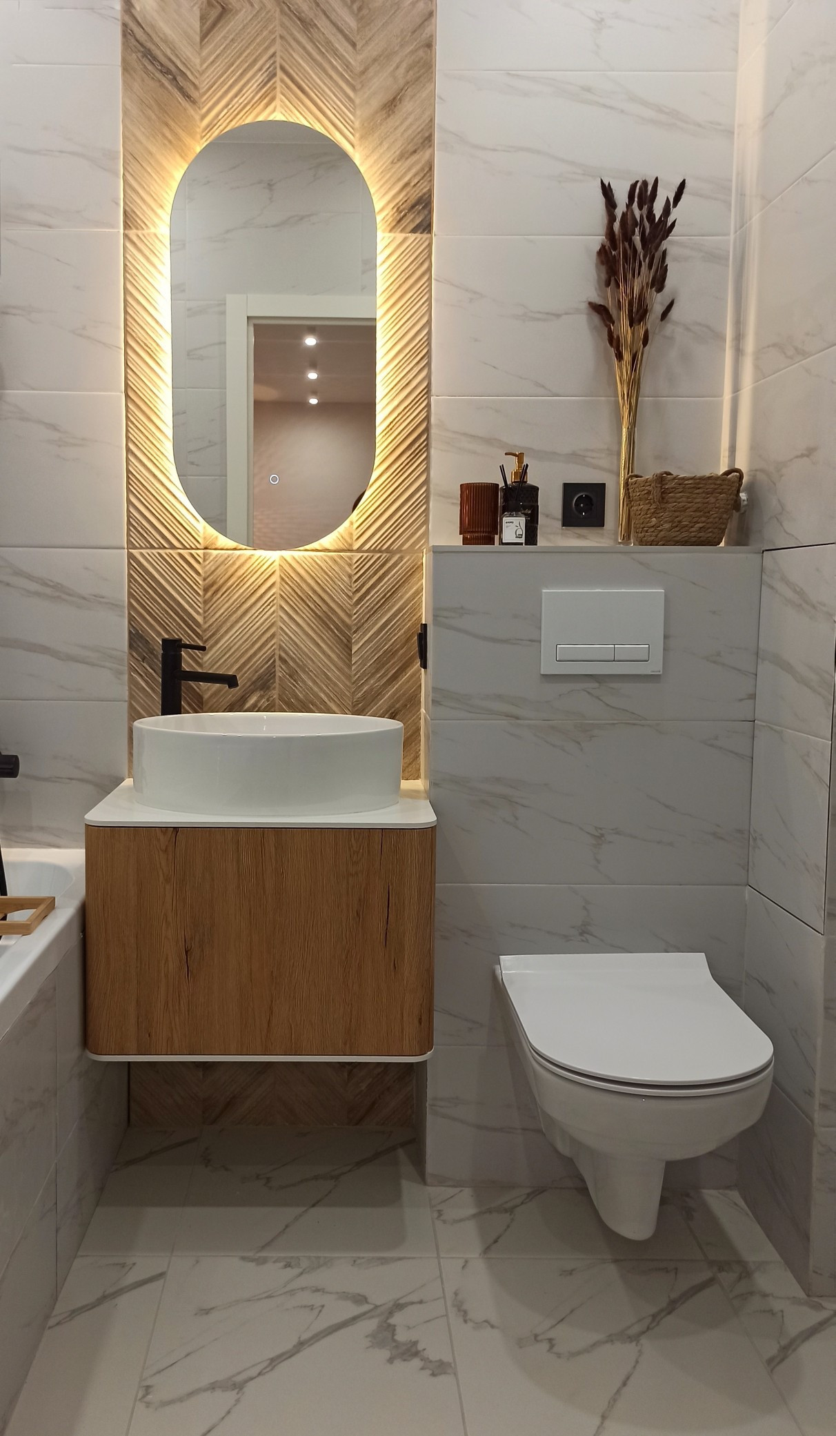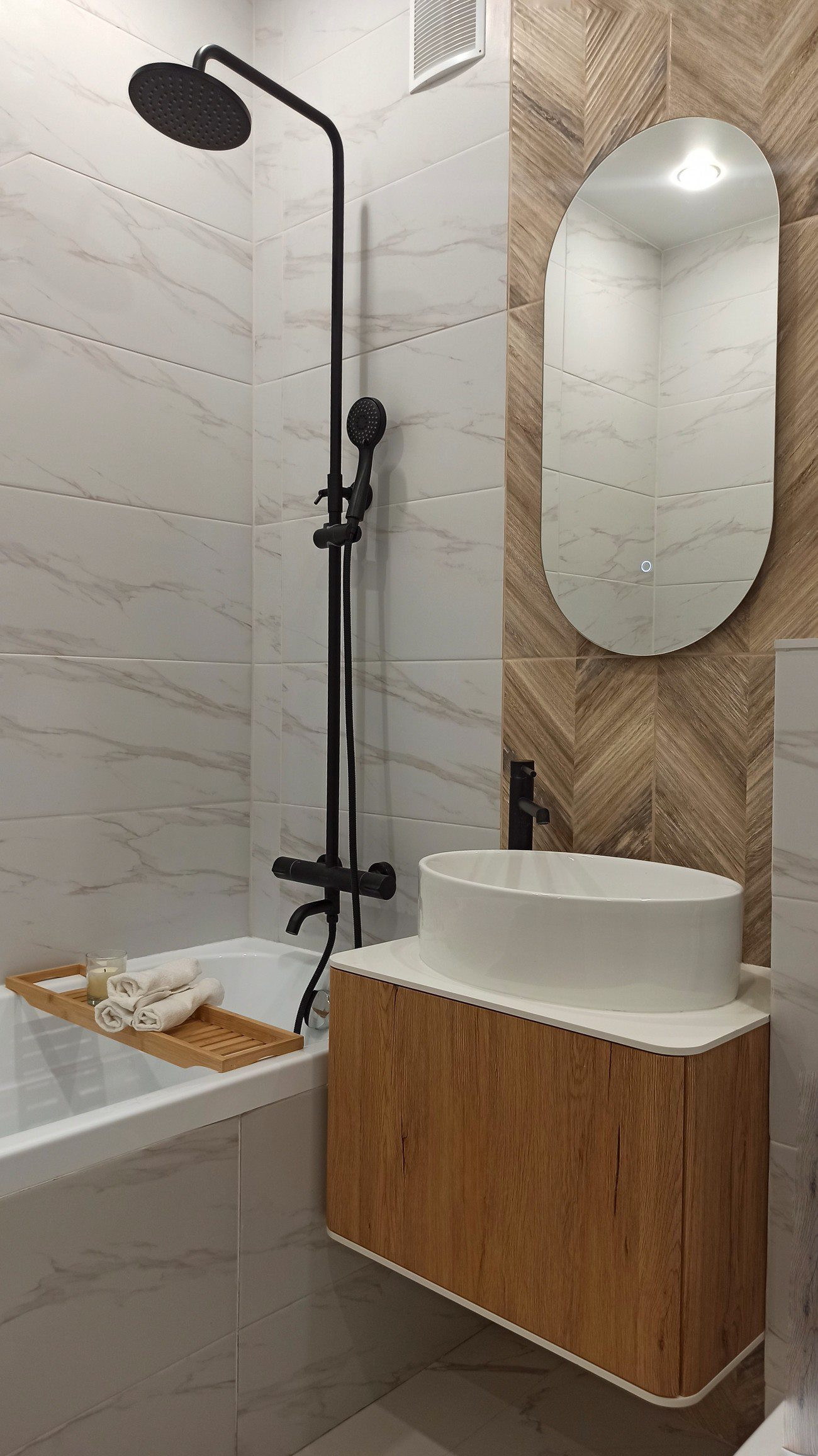 Санузел совмещенный: тропический душ, акриловая ванна, выведены коммуникации под стиральную машину и бойлер, унитаз с инсталляцией, отделка керамогранитом, теплый пол.