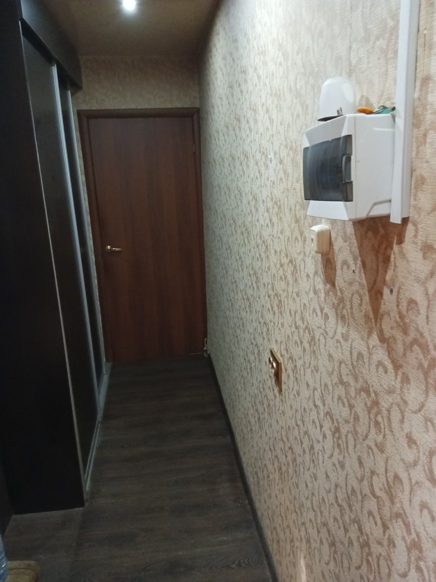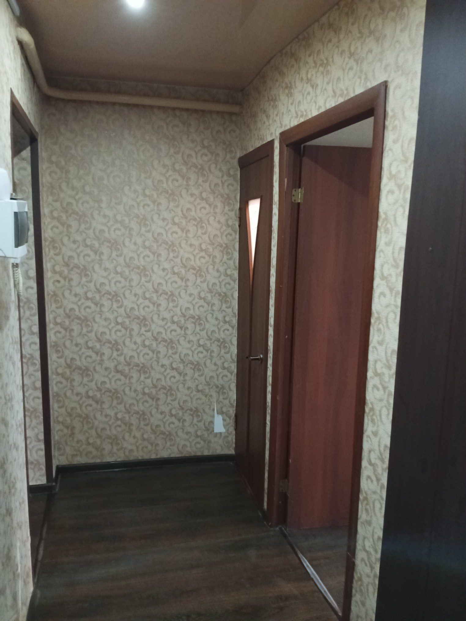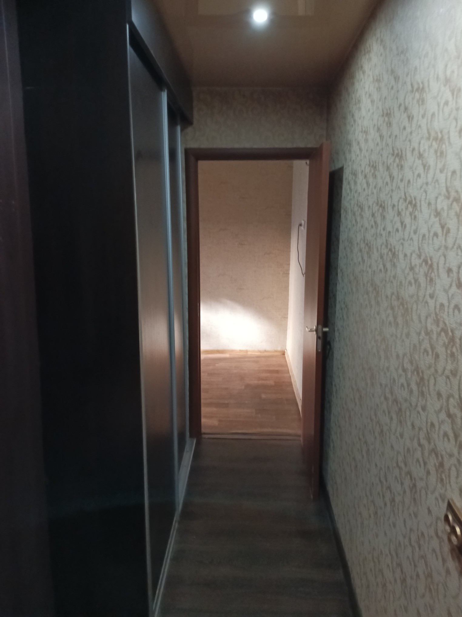 В прихожей на полу линолеум, стены обои, потолок натяжной, точечные светильники.