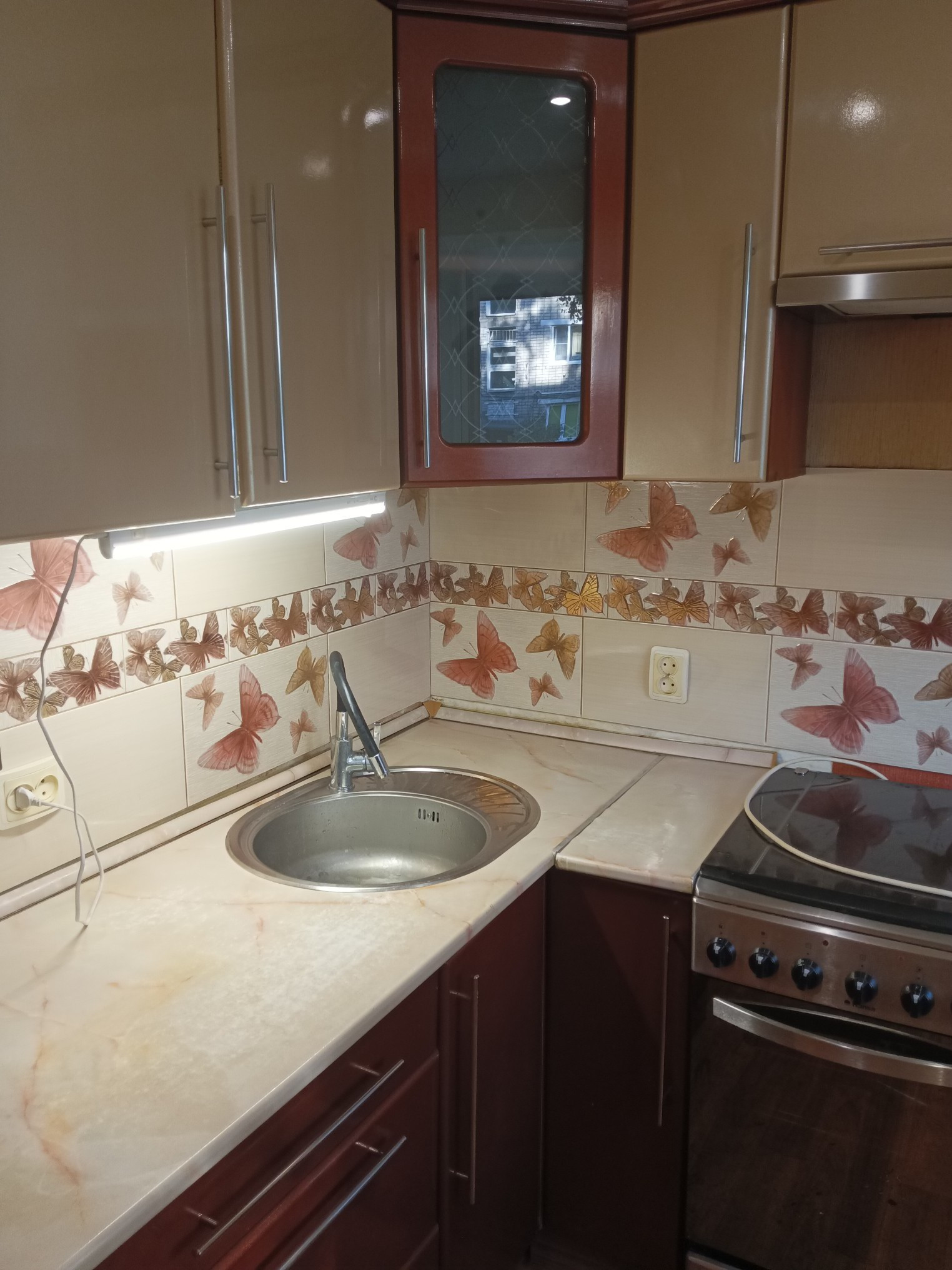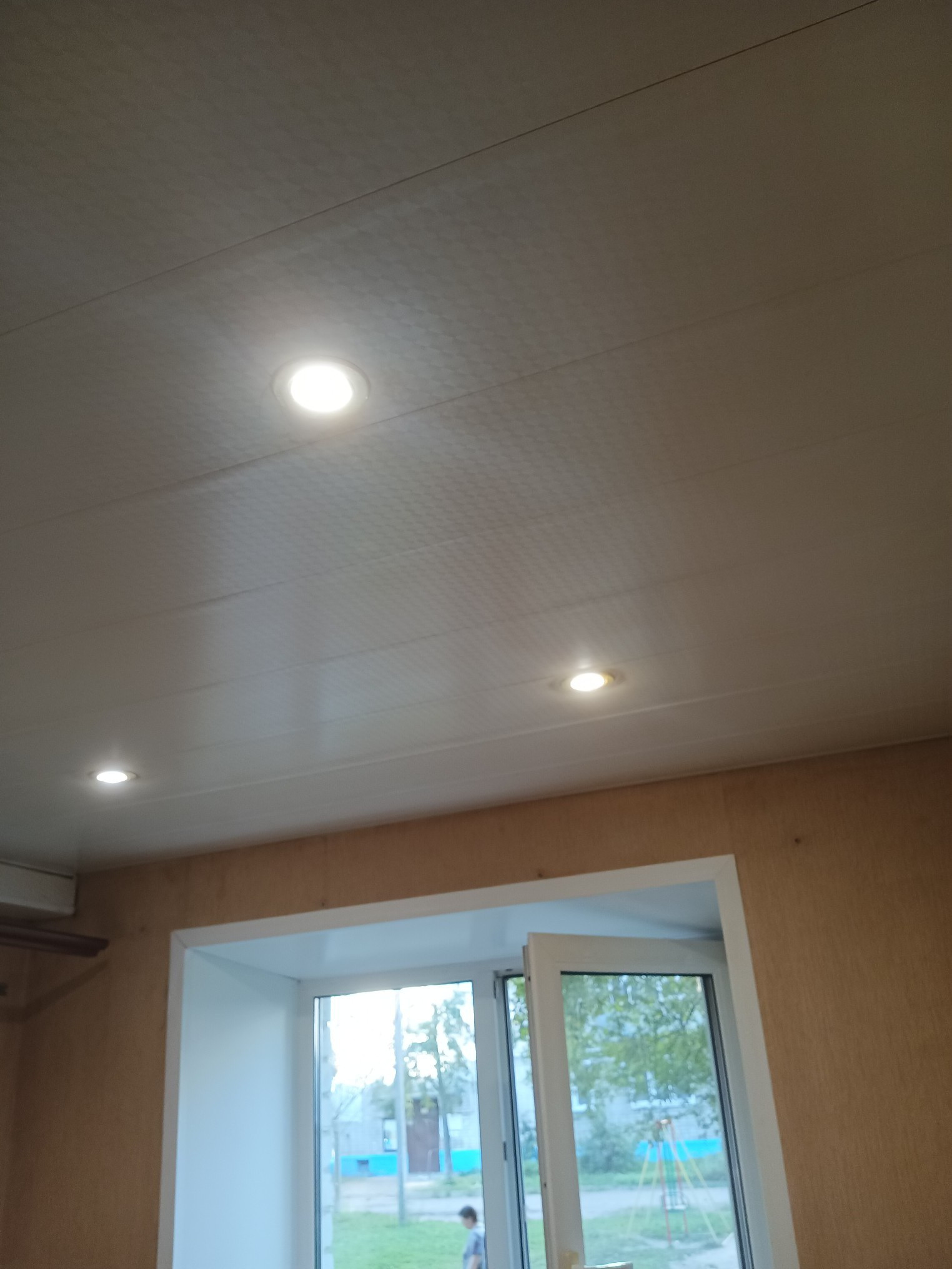 В кухне на полу линолеум, фартук из плитки, стены обои, потолок пластиковые панели, точечные светильники.