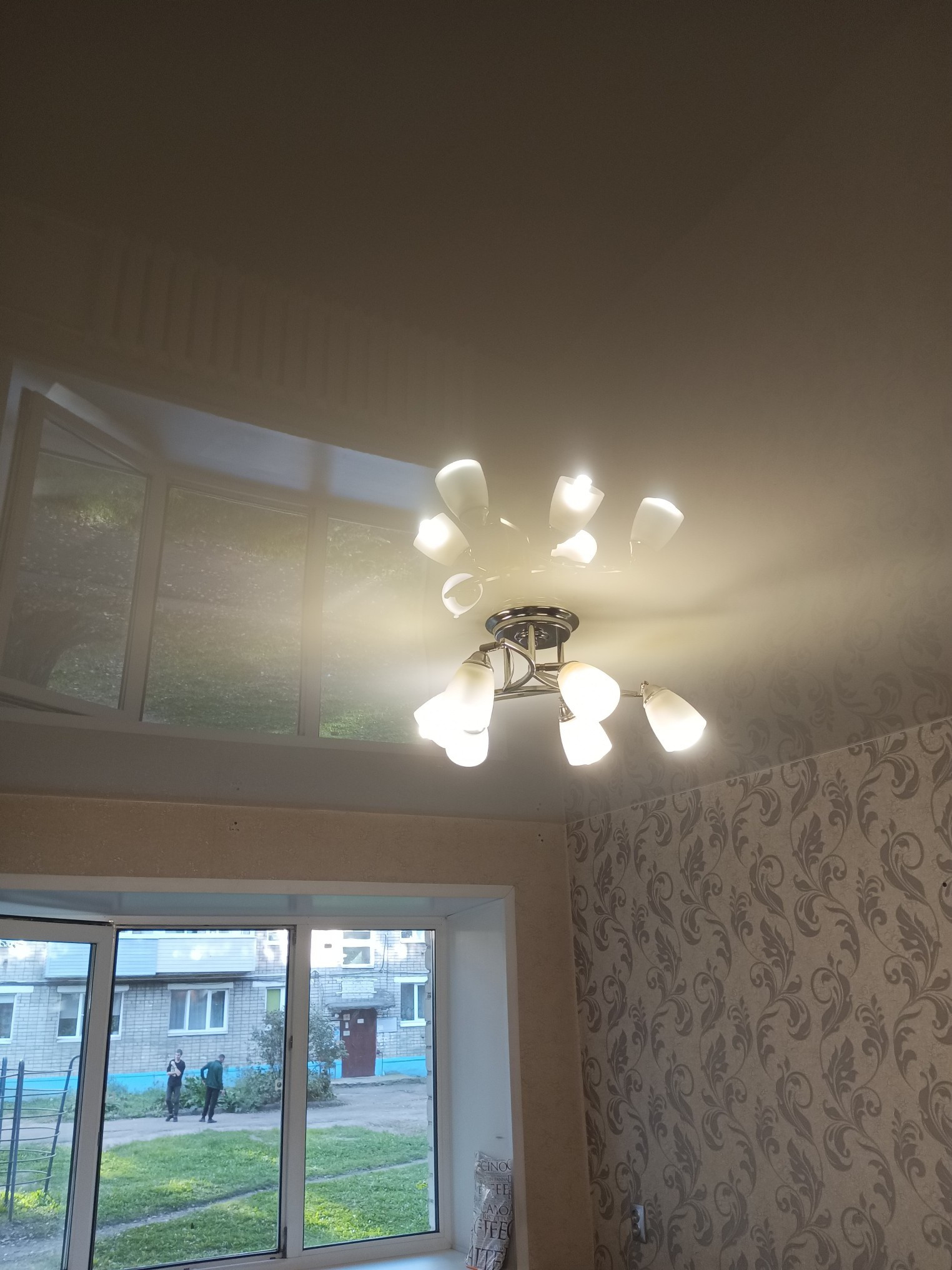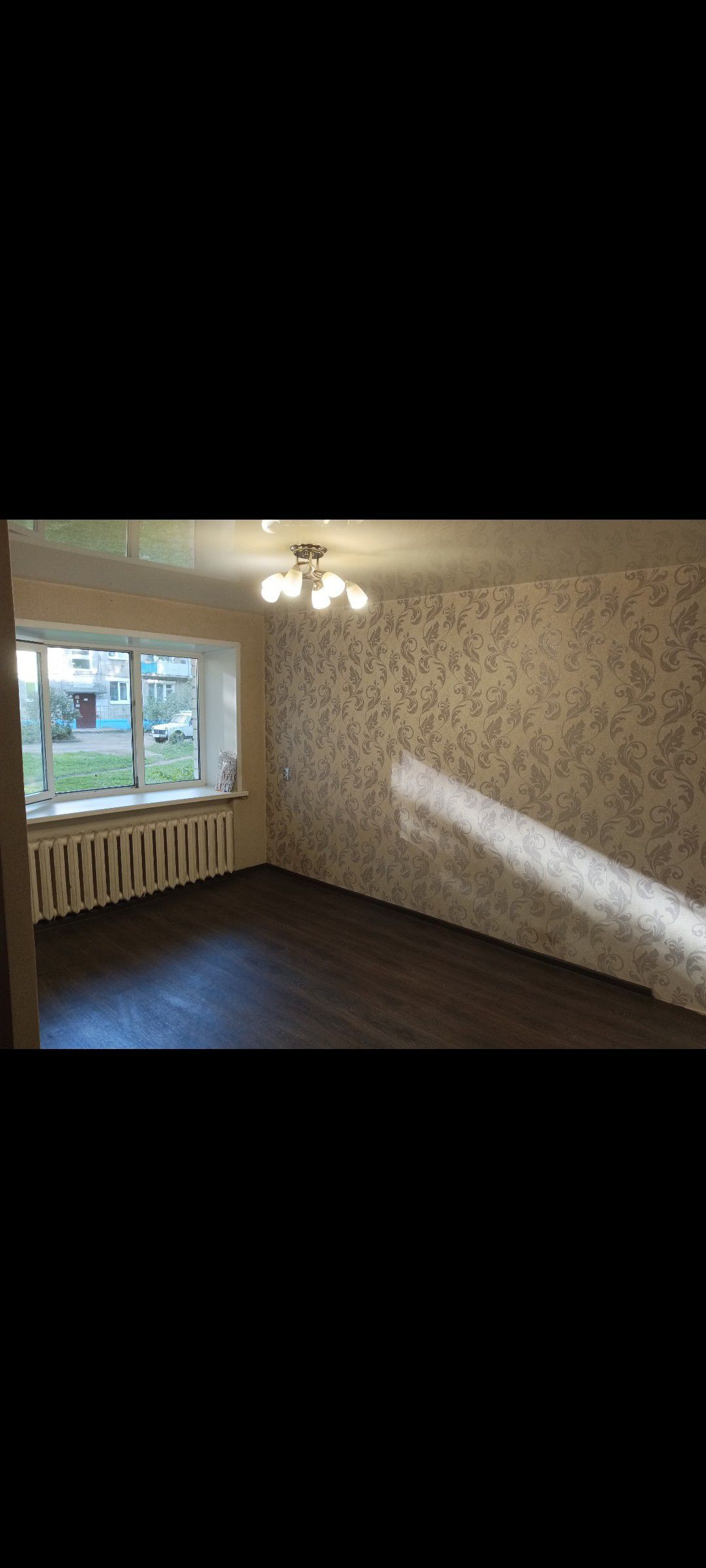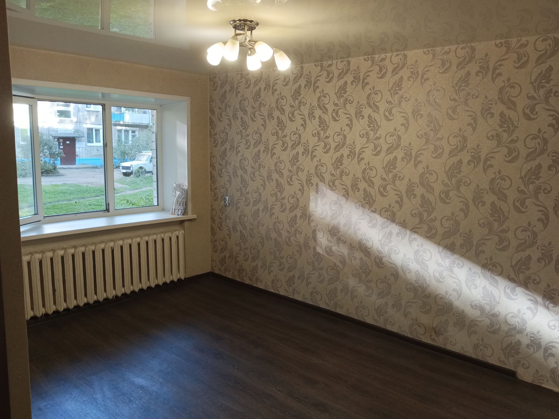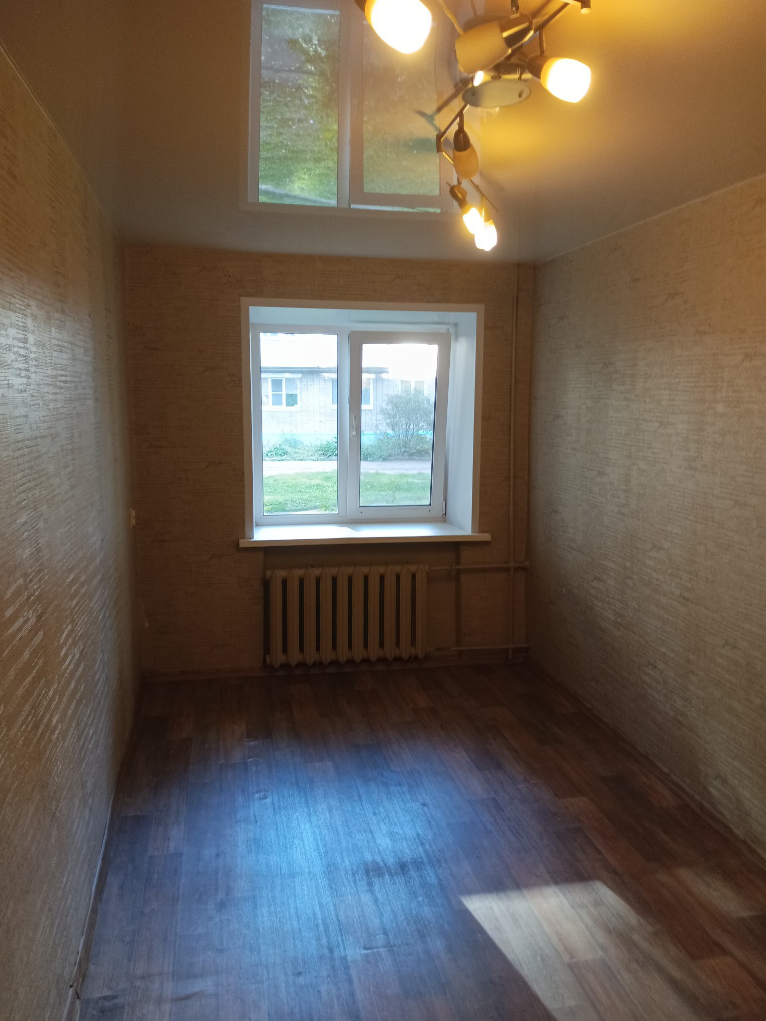 В комнатах на полу линолеум, стены обои, потолок натяжной, люстры остаются.