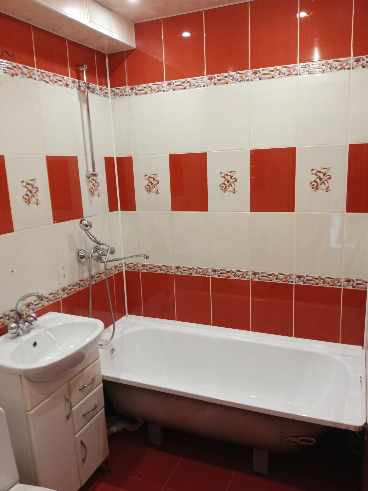 В ванной на полу и стенах плитка, потолок пластиковые панели, точечные светильники.