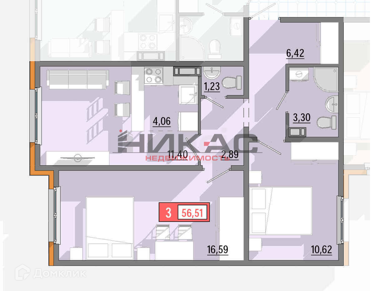 Общая площадь 56.5 м2