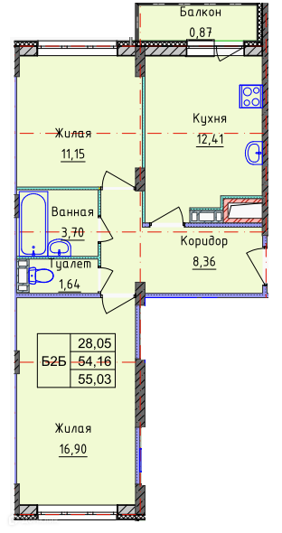 Общая площадь 55.5 м2