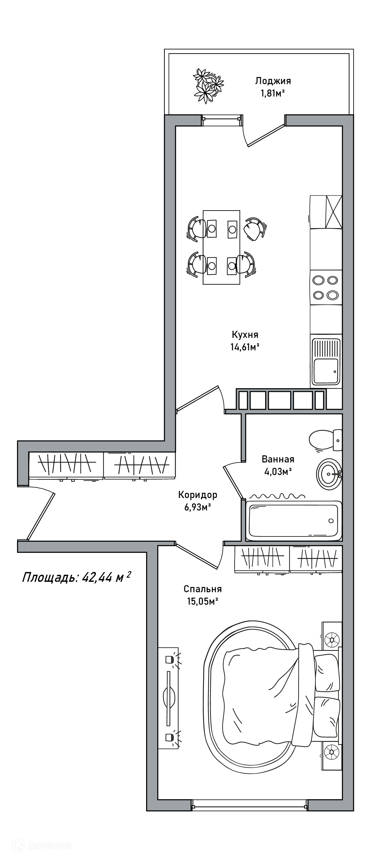 Общая площадь 42.5 м2