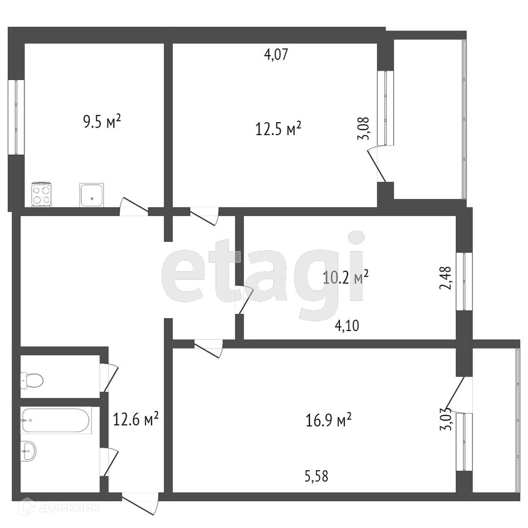 - Комнаты изолированы 16,9 кв.м., 12,5 кв.м. и 10,2 кв. м;
