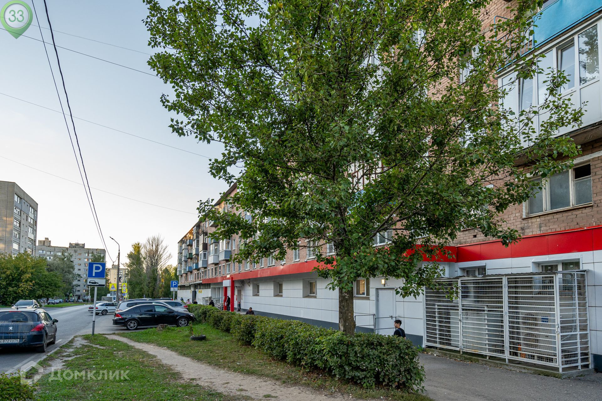 Дом кирпичный, в котором расположено множество магазинов. Вдоль дома - парковка для автомобилей.