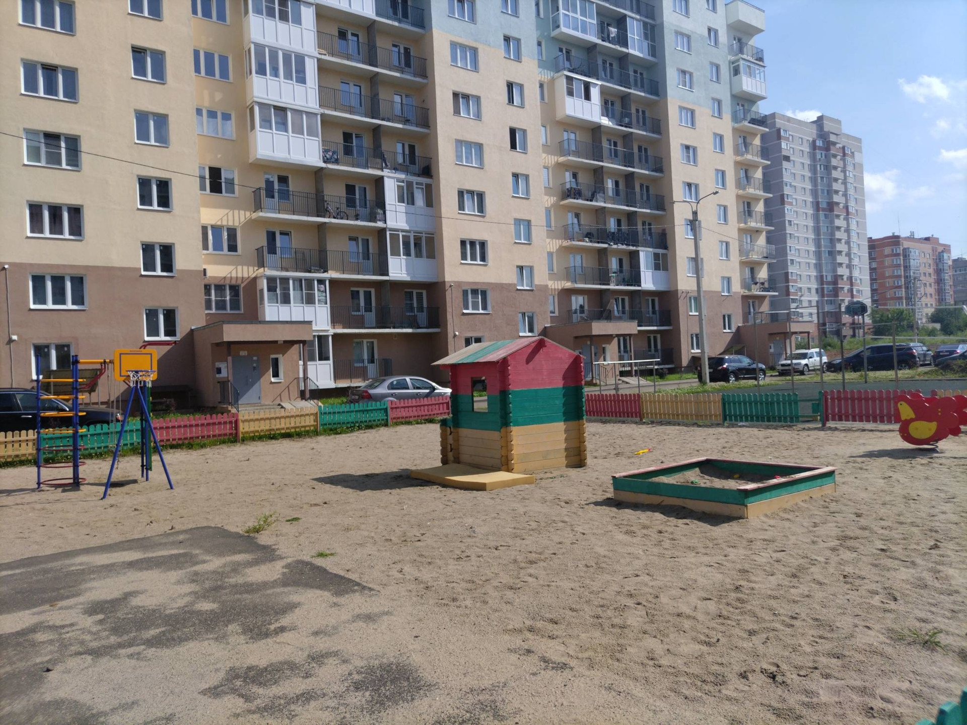 Для комфортного проживания во дворе дома предусмотрены детская и спортивная площадки. Также рядом с домом находятся школа, детский сад, торговый центр, фитнес-центр и парк, что позволяет наслаждаться всеми преимуществами развитой инфраструктуры.