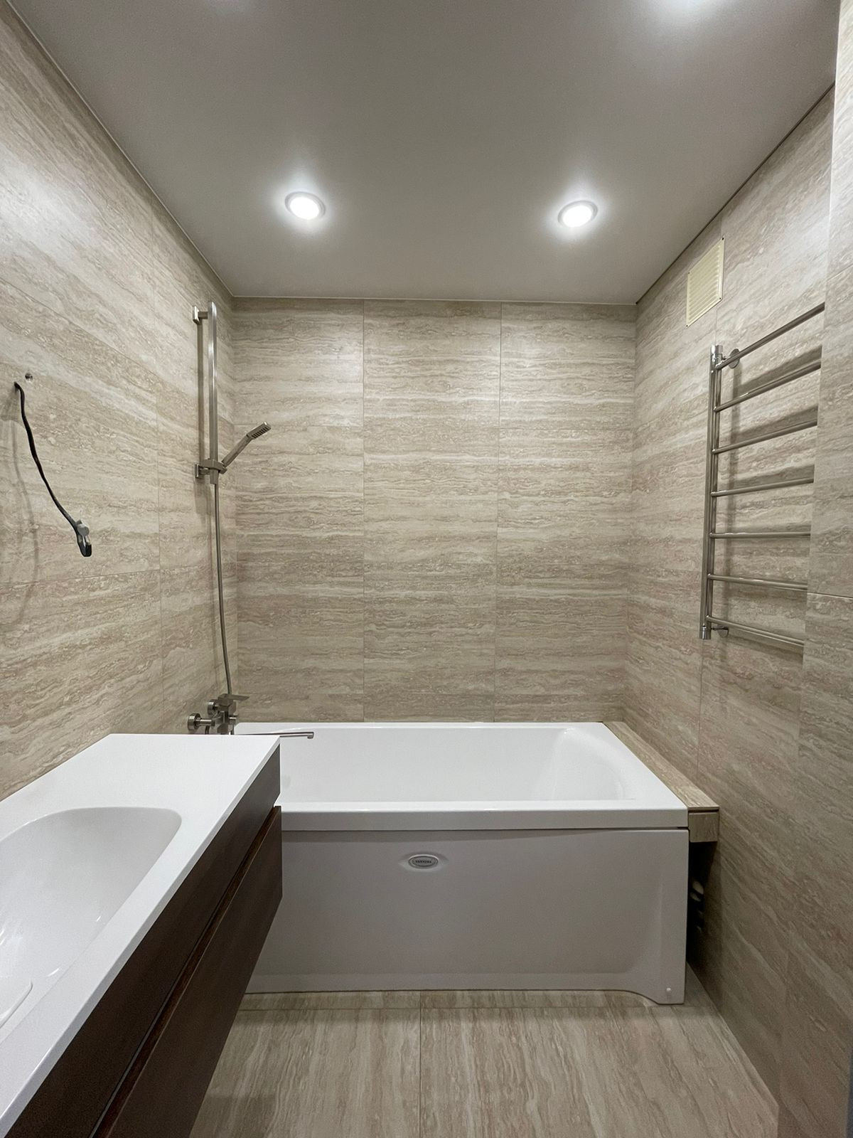 -На кухне, коридоре, в ванной комнате и туалете проведен теплый электрический пол. Плитка в едином цвете из керамогранита 60х60.