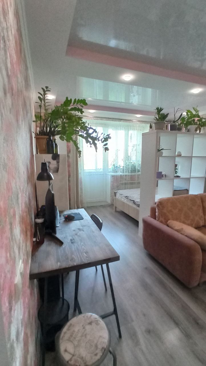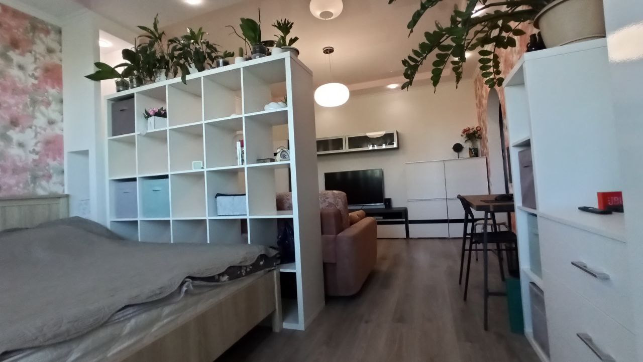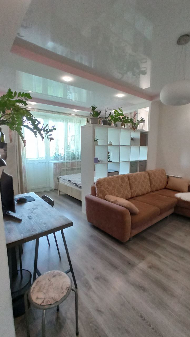 Комната визуально разделена на 2 части: гостиная и спальня.