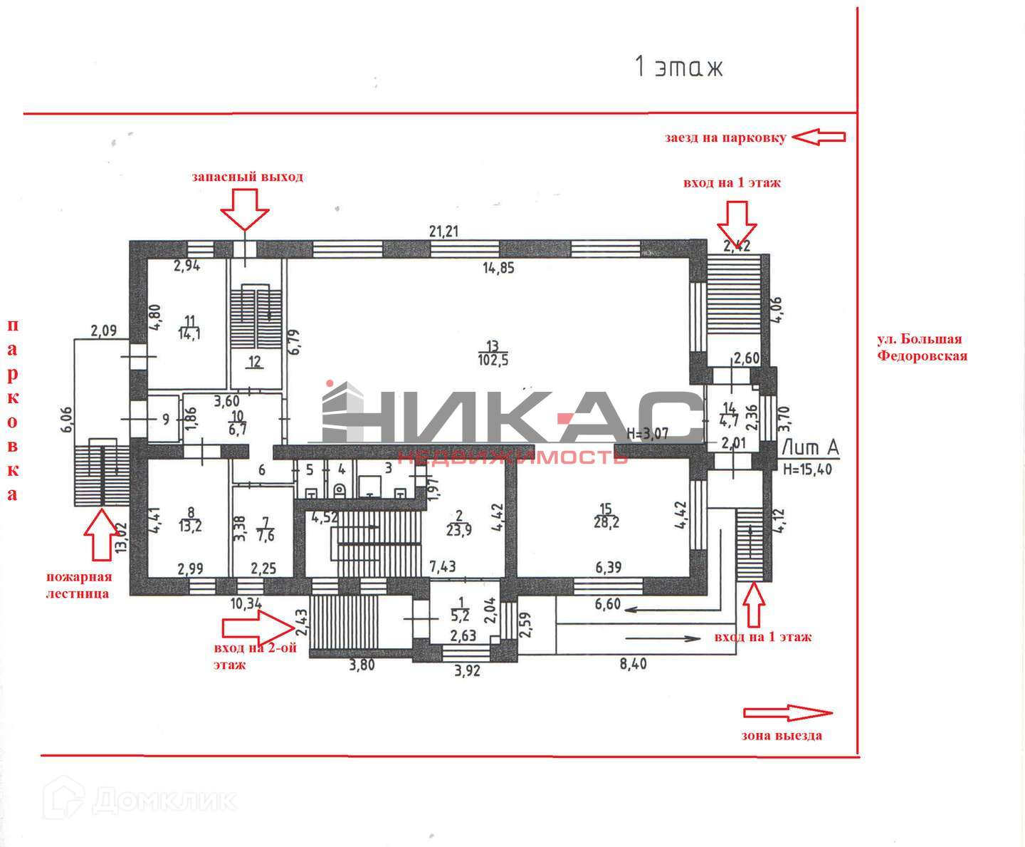 Отдельный вход на 1-ый и 2-ой этажи. Наличие запасного выхода (на 1-ом этаже) и пожарной лестницы (со стороны двора).