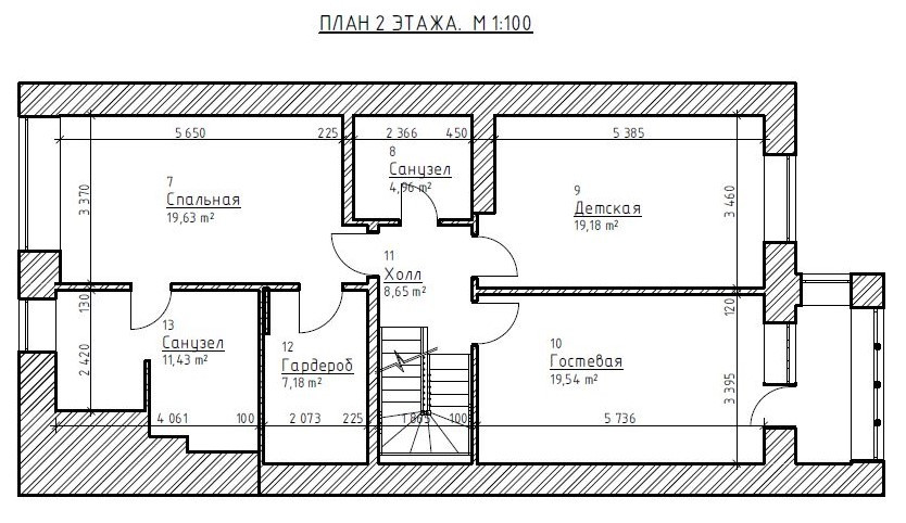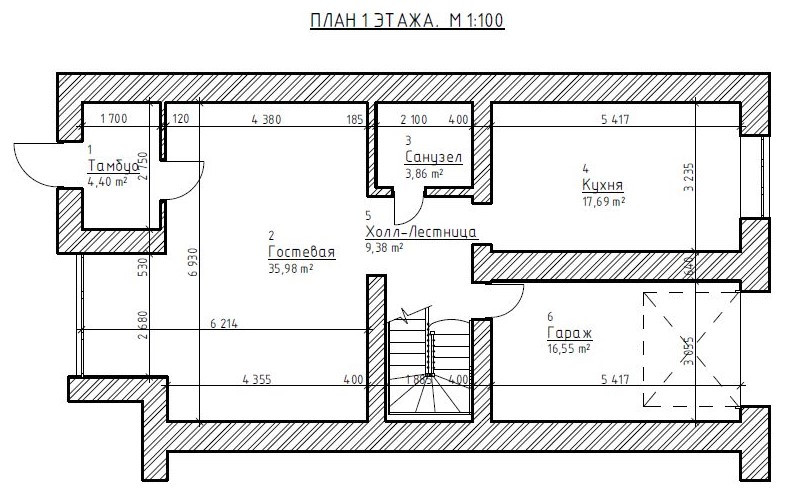 1 этаж: гараж, кухня, гостиная, техническое помещение с санузлом.