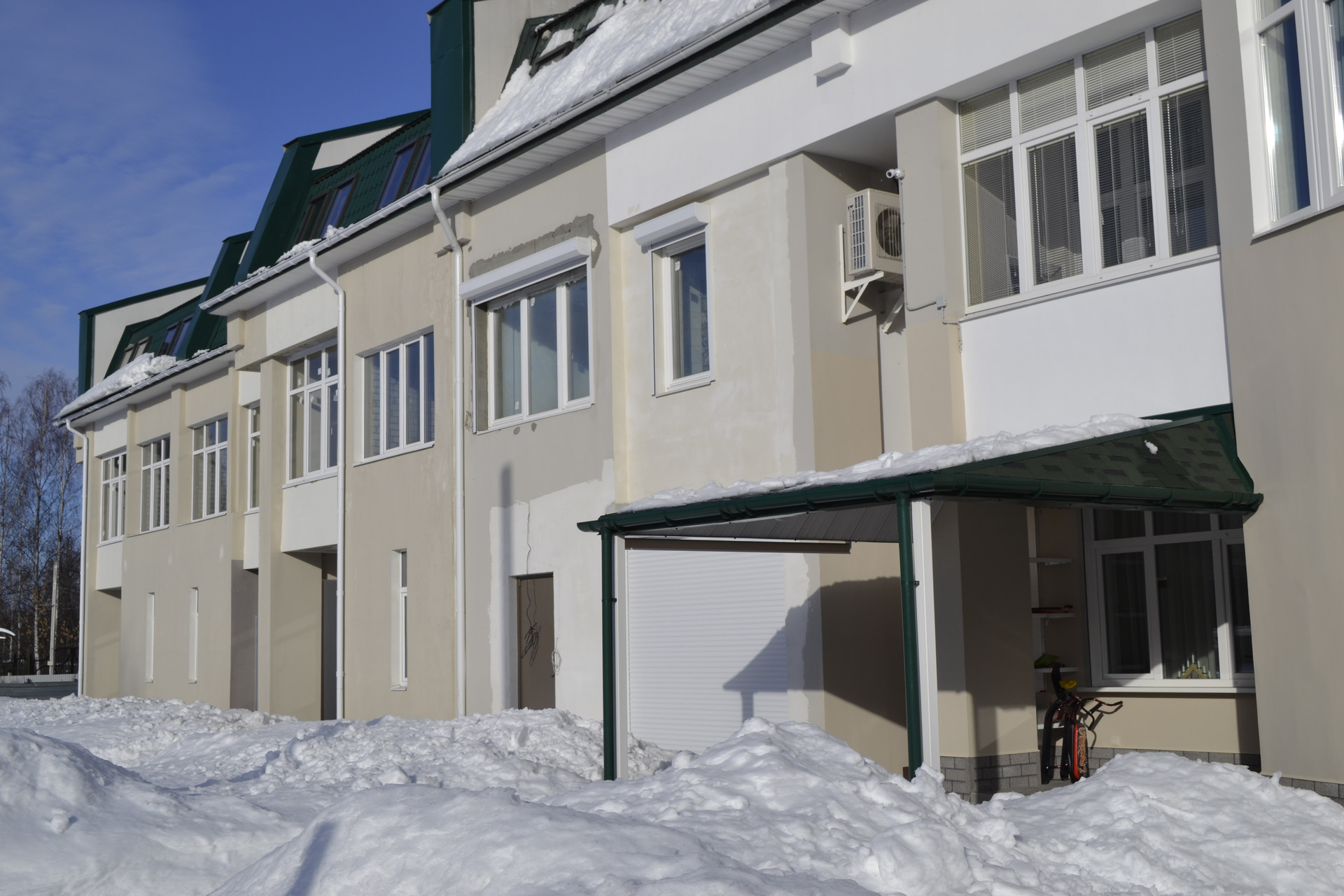 Таунхаус построен из кирпича, фасад оштукатурен.