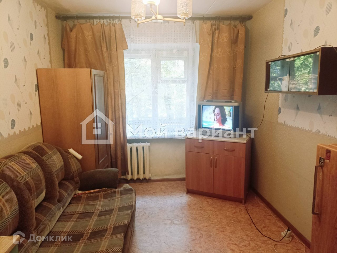 Комната с жилой площадью 15 м.кв. в коммунальной квартире из пяти комнат. В комнате произведен косметический ремонт и мебелизована: шкаф, диван, стол, тумба, телевизор, книжная полка, стиральная машина, встроенный шкаф. Соседи хорошие.