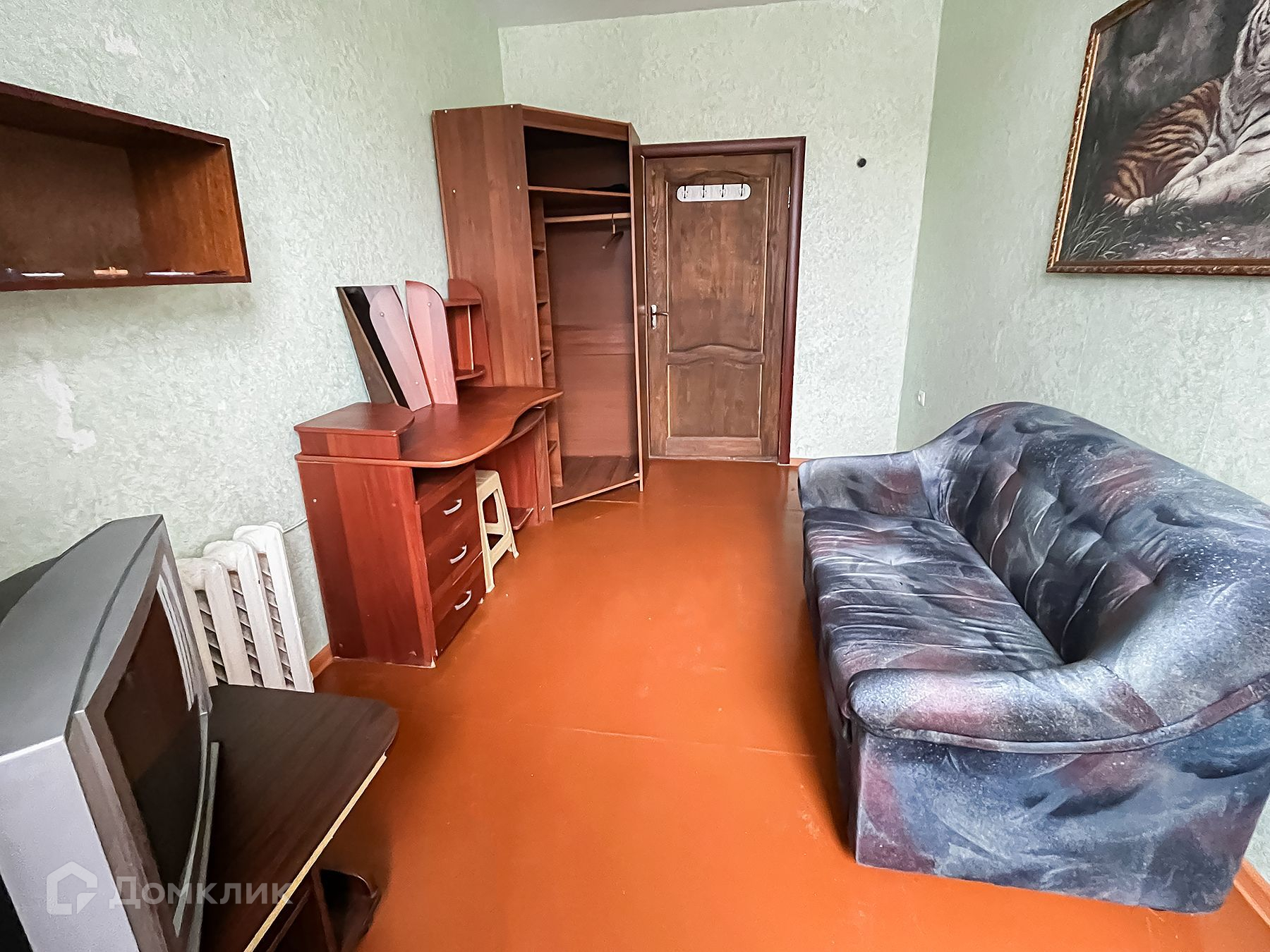 Комната частично меблирована, есть спальное место и стенка для хранения вещей. Из техники есть холодильник и телевизор.