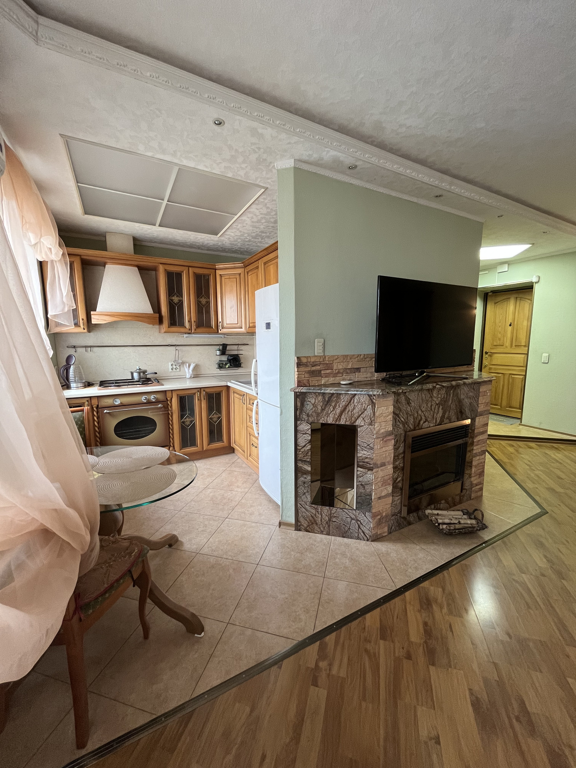 Бытовая техника - холодильник, ЖК телевизор, вытяжка, эл. чайник, сплит система, стиральная машина, духовой шкаф, камин.