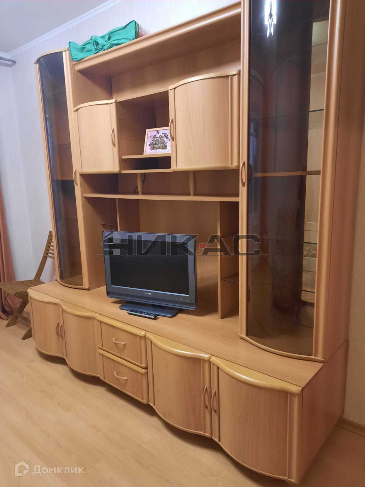 Комната 1 с выходом на лоджию: диван раскладной двуспальный, стенка современного образца, телевизор, журнальный столик.
