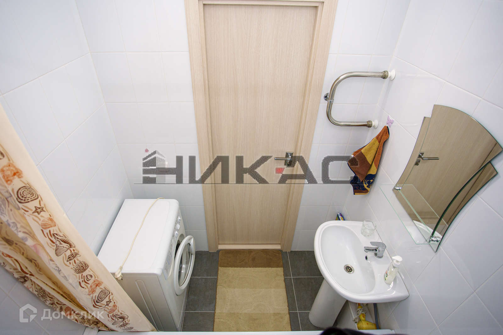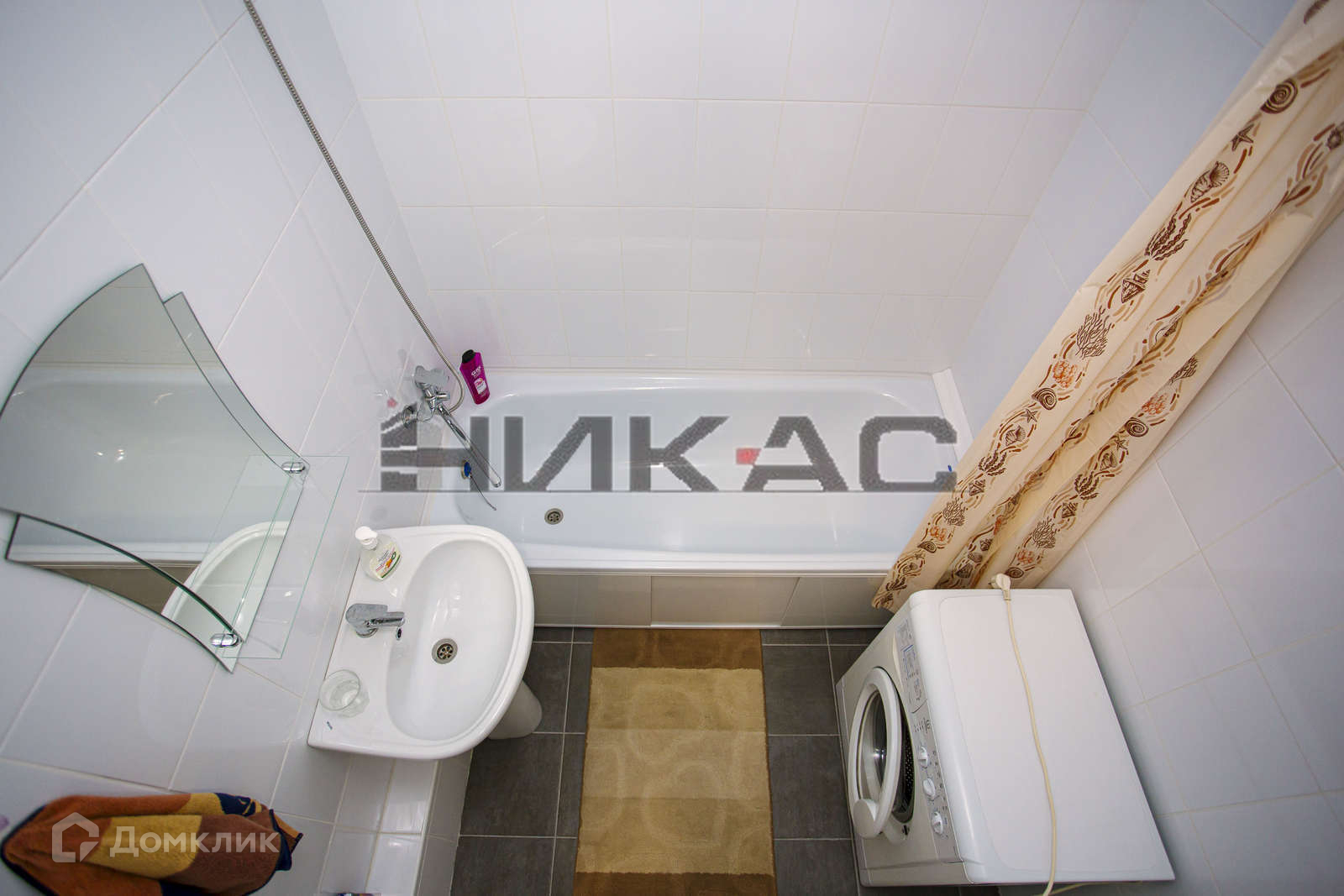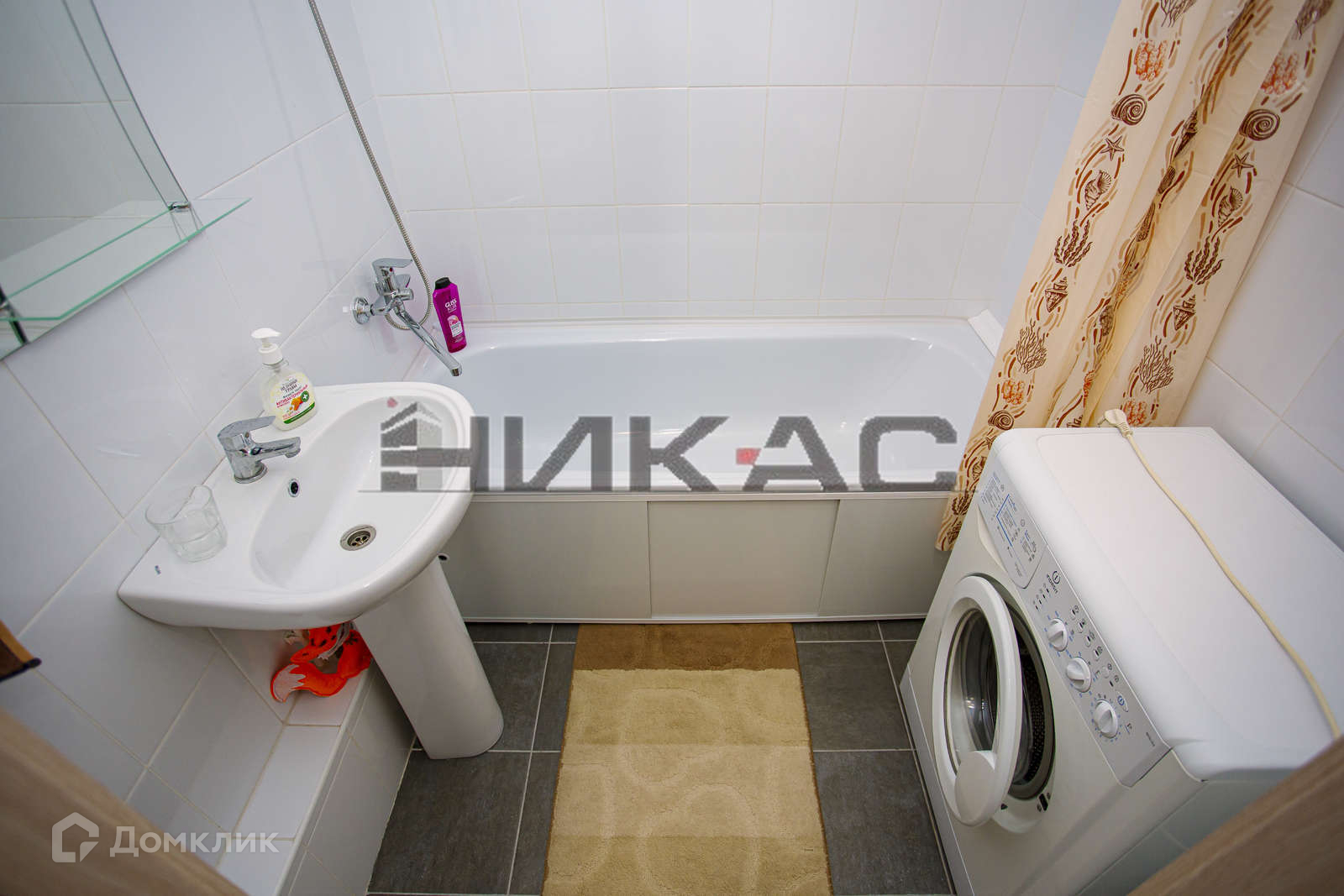Ванная комната: зеркало с полочкой, экран под ванной, стиральная машина автомат.