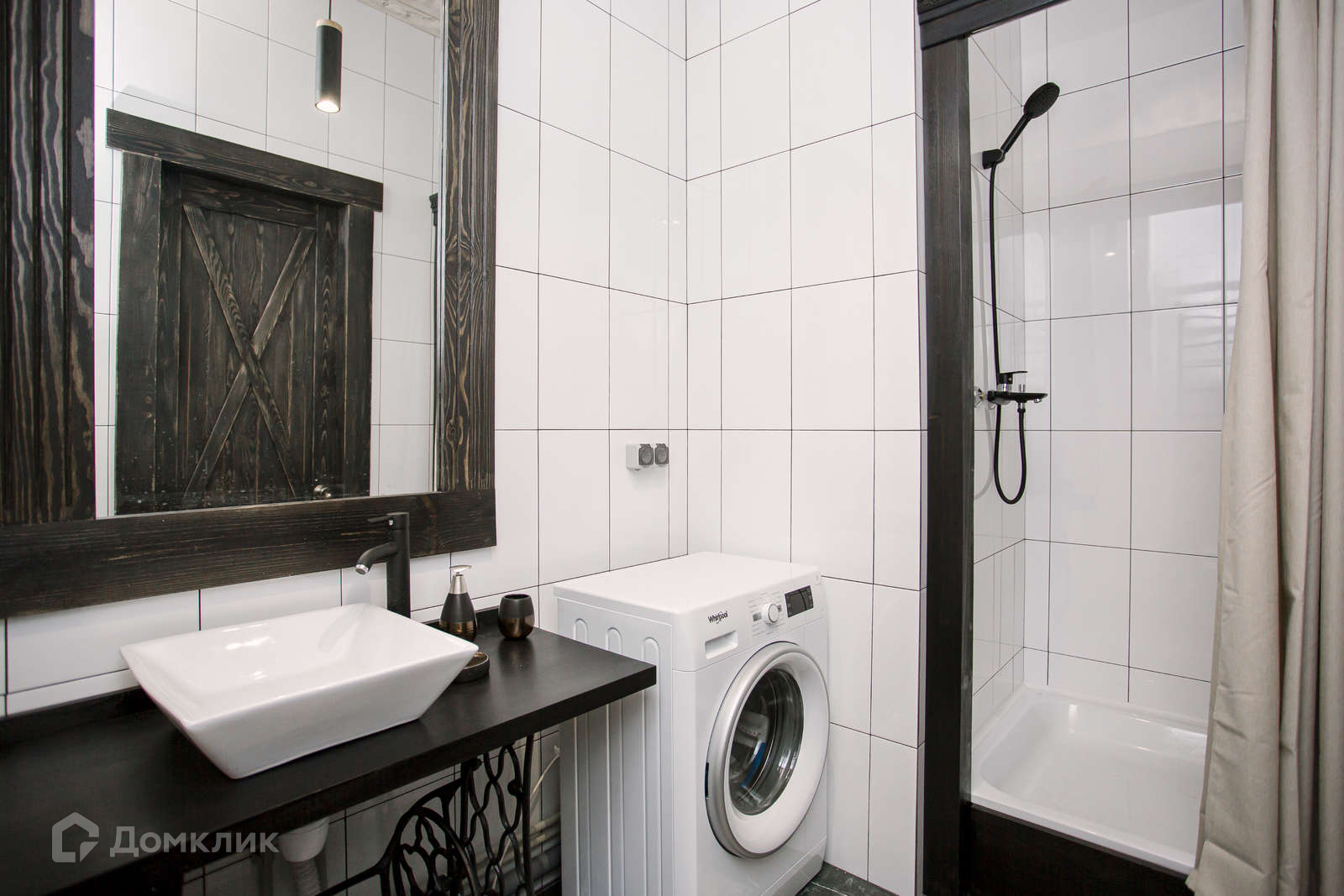 Объект разделен на несколько зон: просторная кухня-гостиная, отделенная декоративной перегородкой от зоны отдыха, полноценная гардеробная с вешалами и удобными полками, санузел в кафельной плитке с душевой.