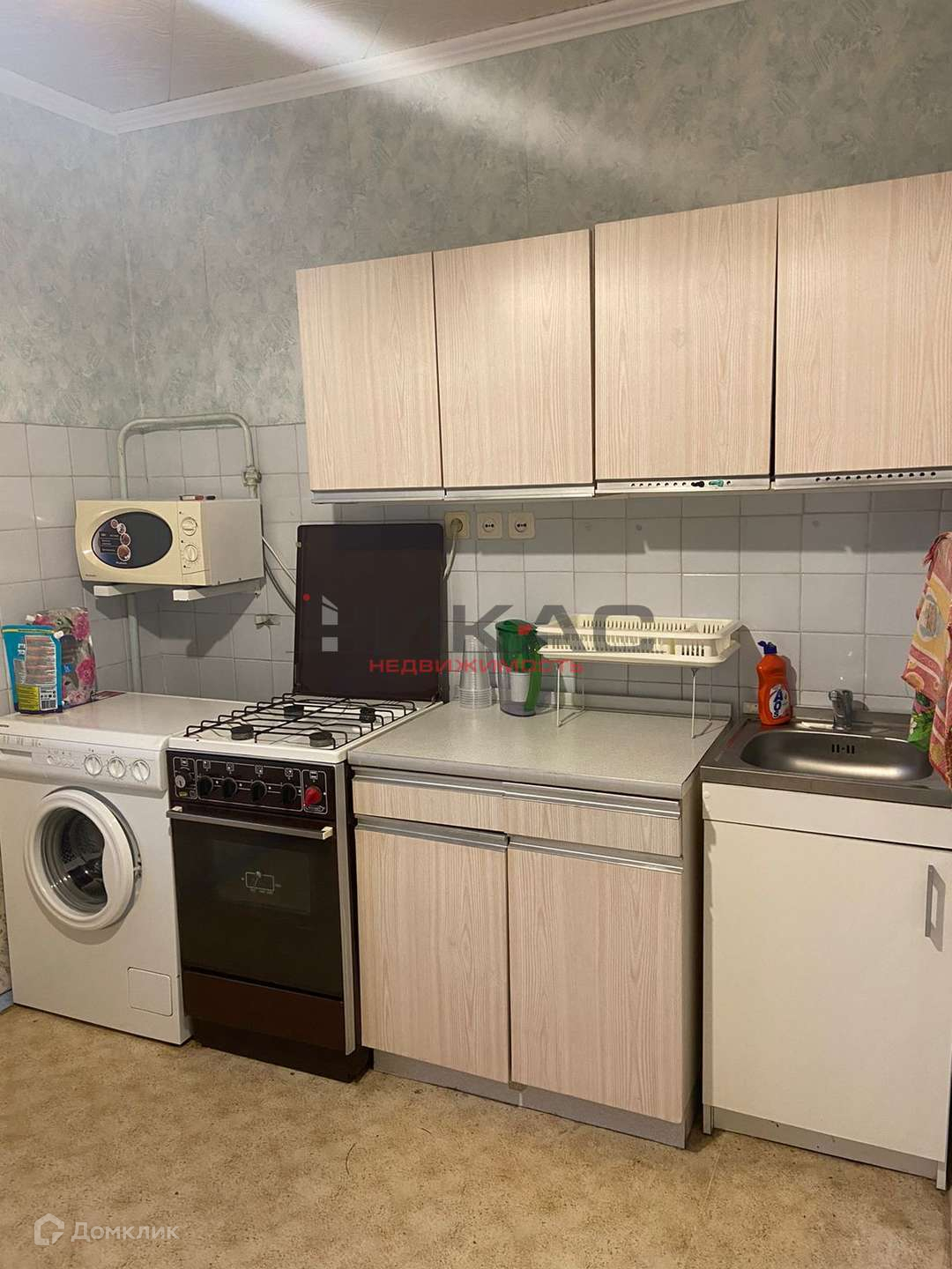 Кухонный гарнитур, стиральная машина автомат, микроволновая печь, обеденный стол, диван двуспальный, тумба под телевизор, телевизор, стенка горка.