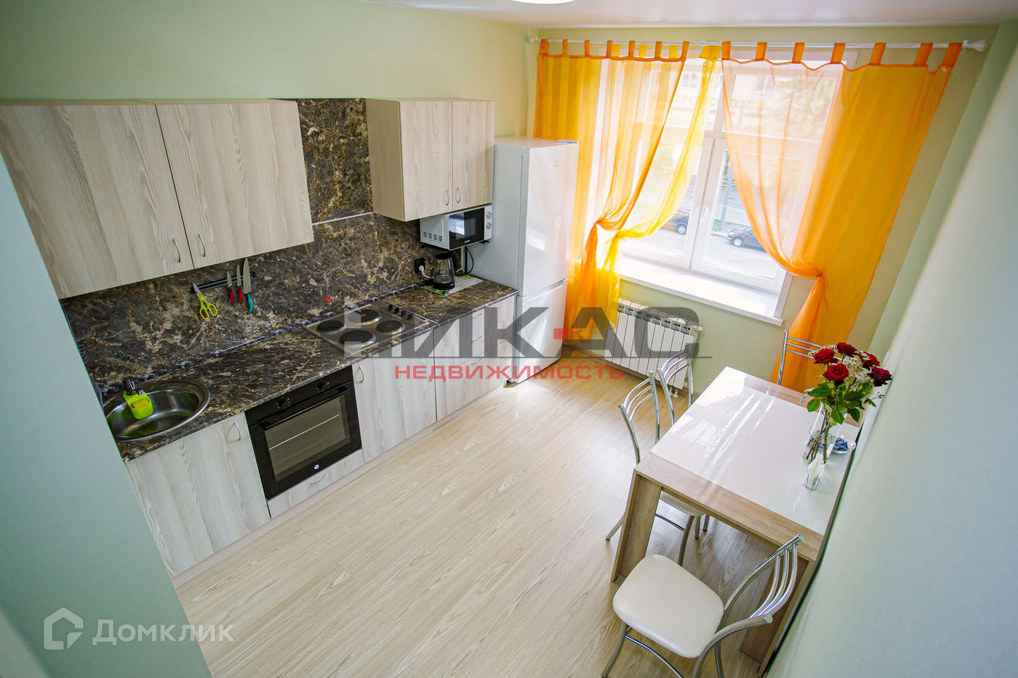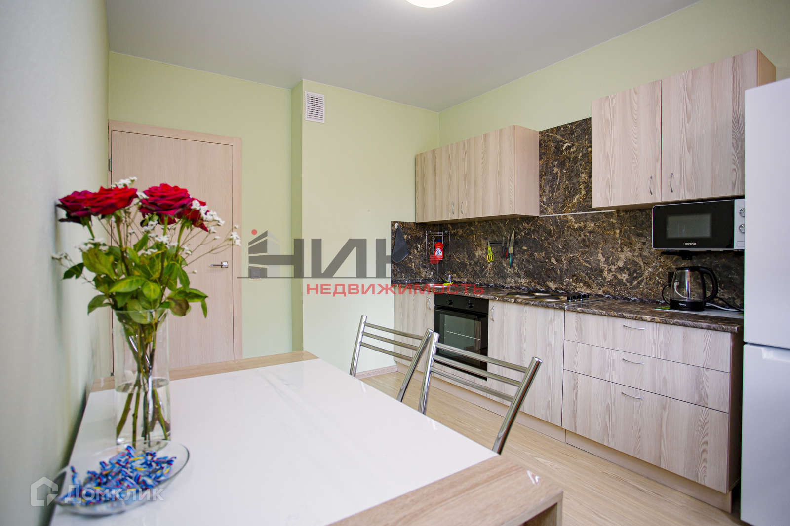 -на кухне установлен кухонный гарнитур, варочная панель, духовой шкаф, вытяжка, свч, электрический чайник, двухкамерный холодильник, обеденный стол и стулья.