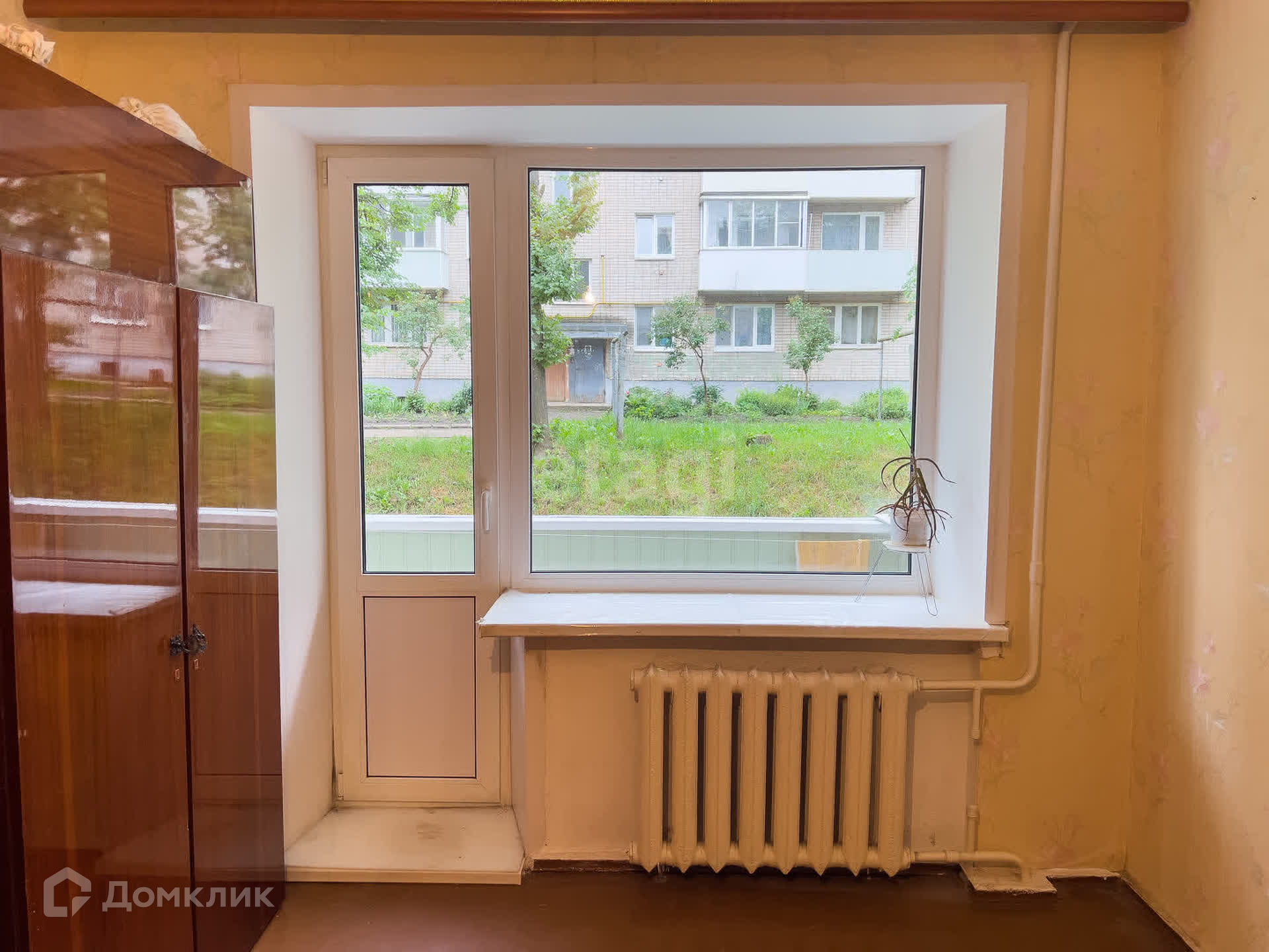 Под ремонт. Окна пластиковые, балкон не застеклен, пол деревянный, полоток в комнате натяжной. Батареи чугунные.