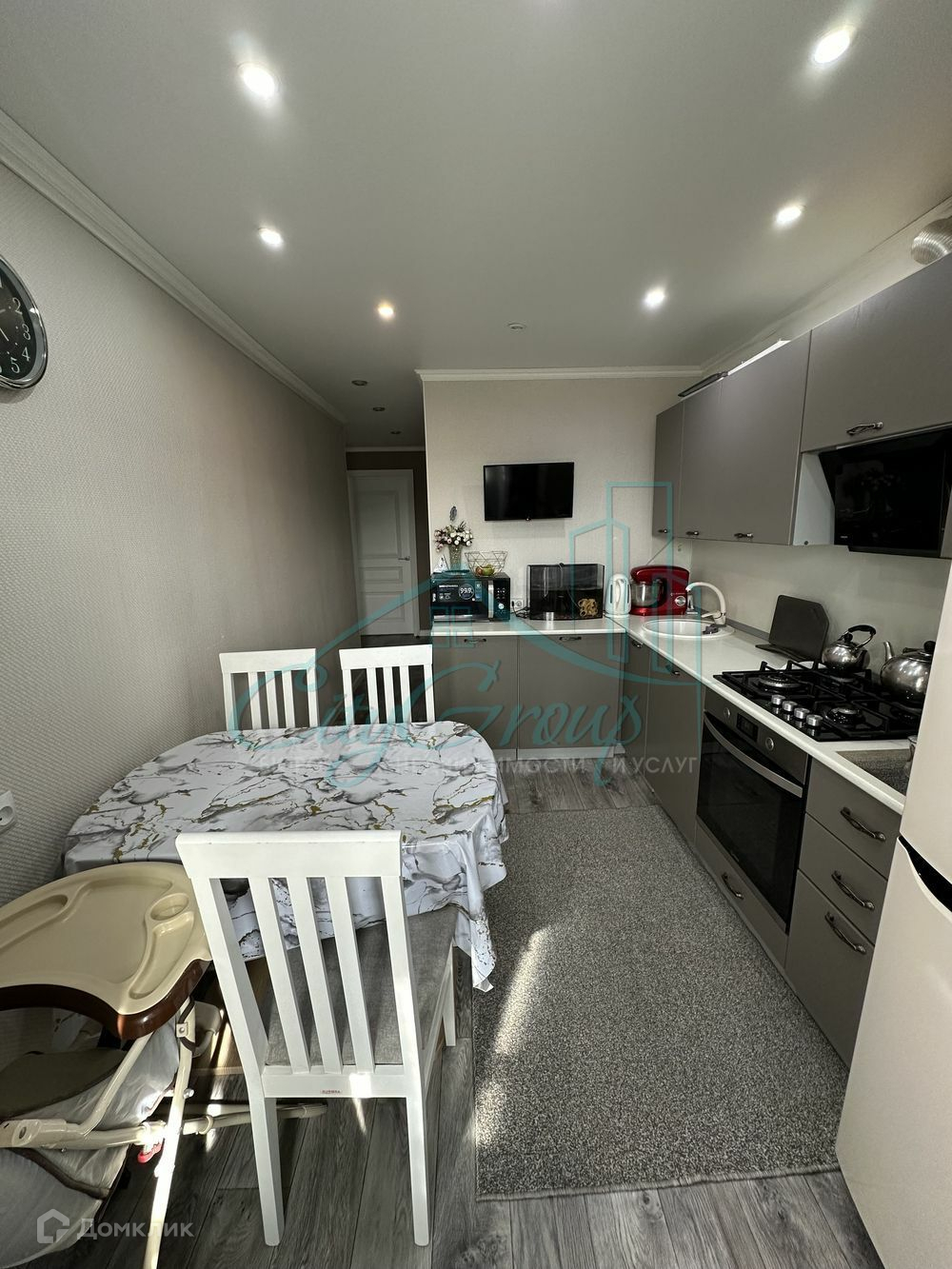 В квартире сделан евроремонт, новым хозяевам остаётся кухонный гарнитур с встроенной техникой (варочная панель, духовой шкаф), кондиционер.