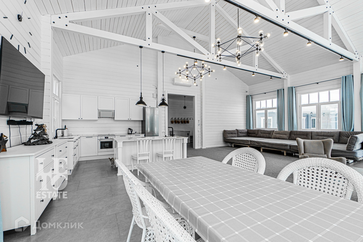 Планировка дома включает в себя просторный зал с кухней и обеденной зоной и панорамными окнами, с которых открывается вид на участок, также пять комфортных спален со своими санузлами и зону отдыха на мансарде, обеспечивая достаточное место для всей семьи и гостей. Высокие потолки, достигающие 6 метров, придают комнатам ощущение простора и воздушности.
