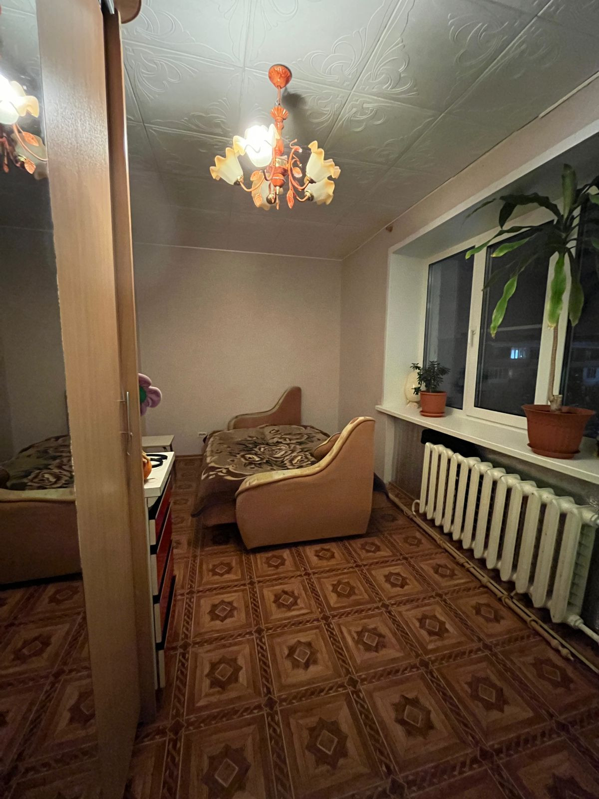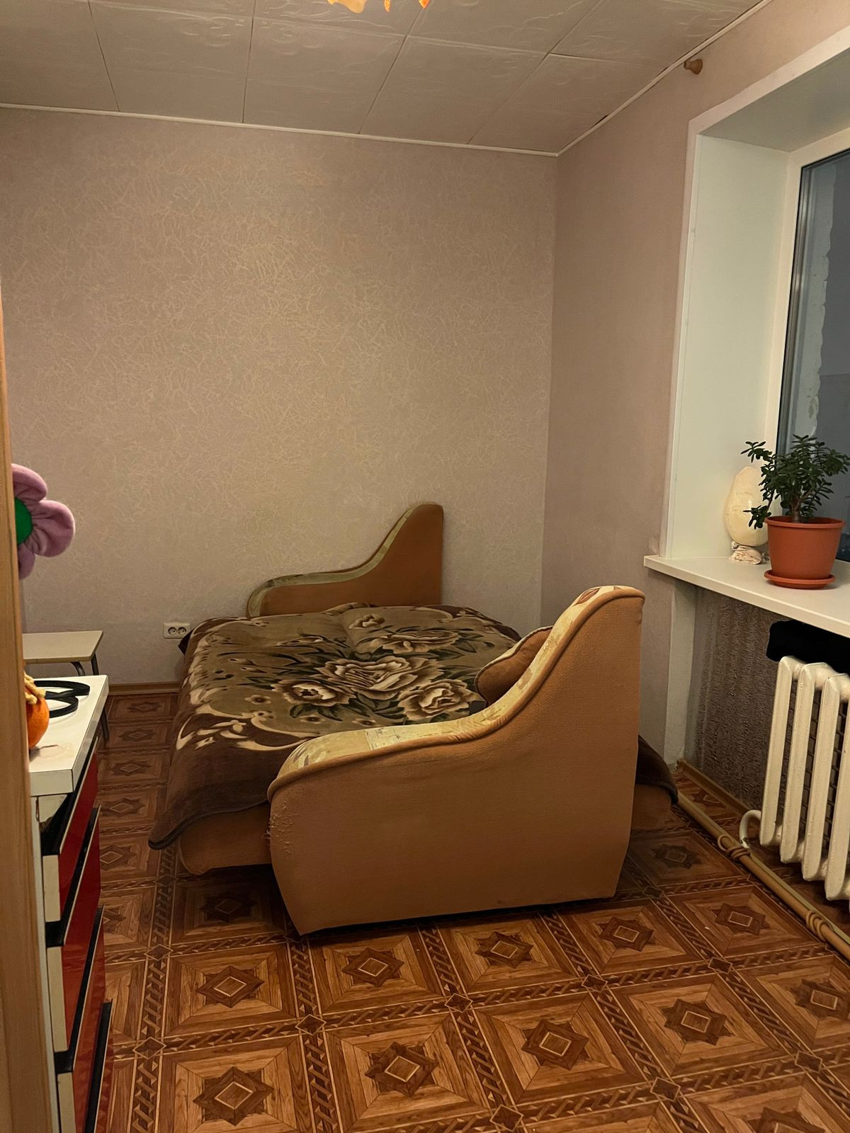 Комната в обычном состоянии: входная металлическая дверь, установлено большое пластиковое окно, имеется выделенное место для кухни. Комната очень теплая и светлая.