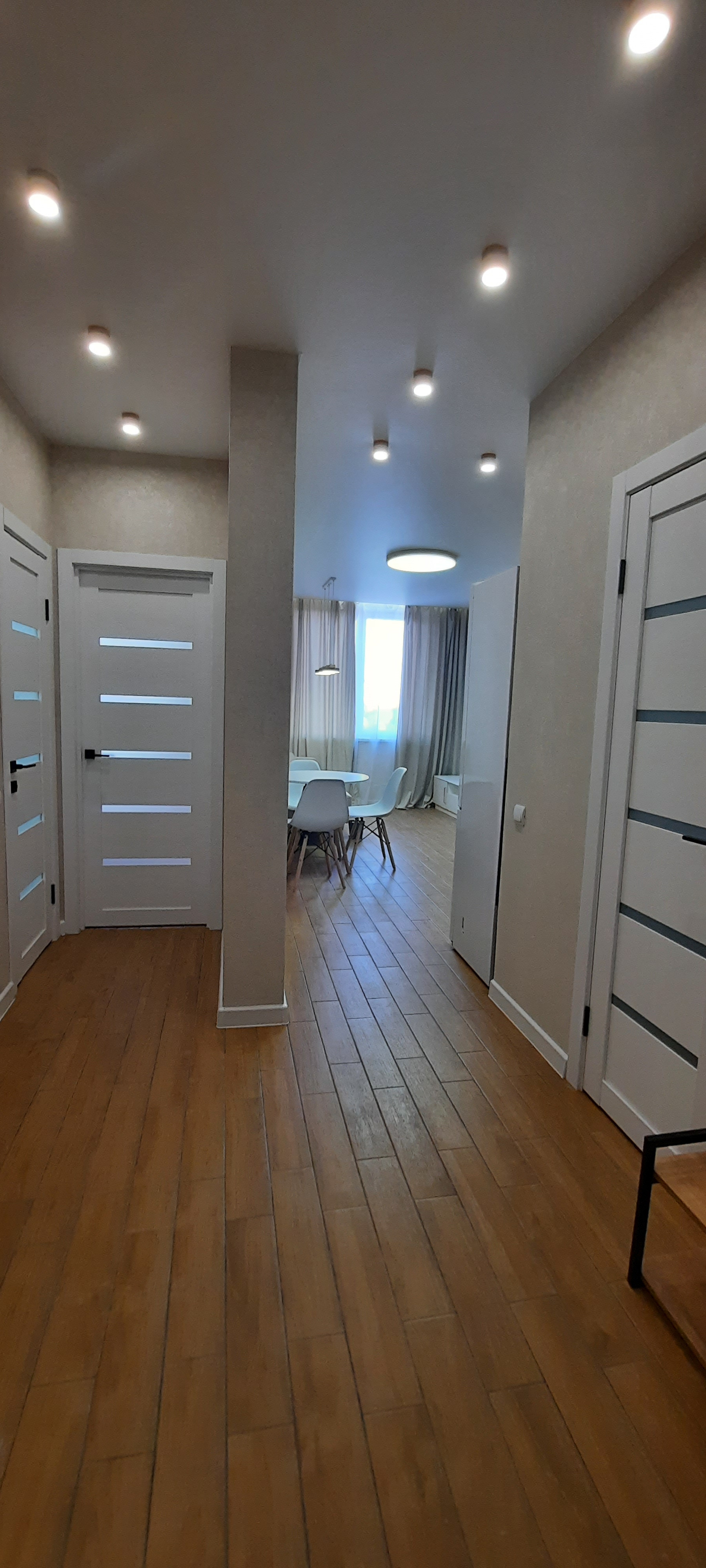 Реализовано интересное решение по освещению помещений, управление переключением режимов освещения в квартире может осуществляться дистанционно с пульта, регулируется как цветовая гамма, так и зоны освещения.