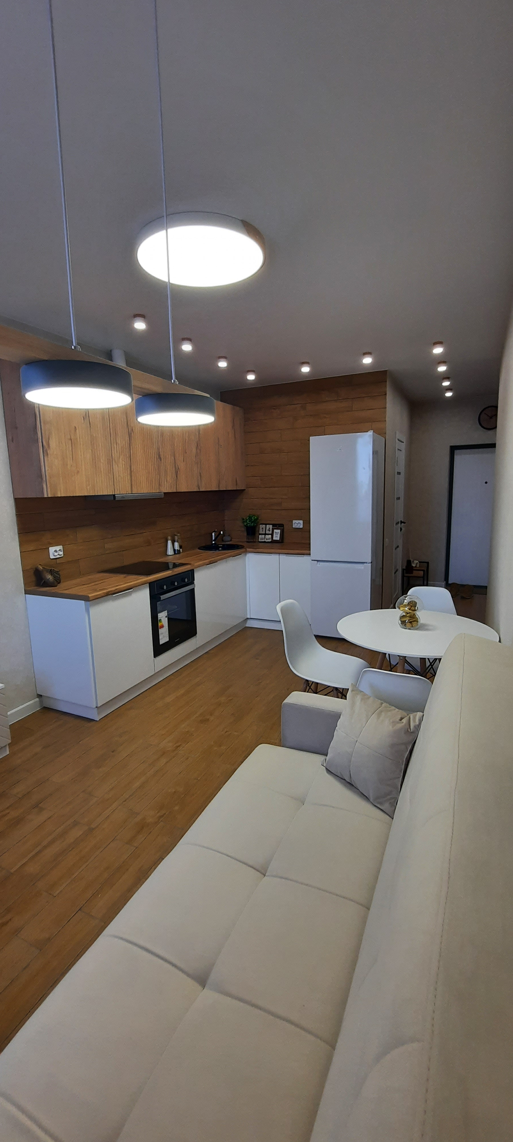 Керамогранит kеrаmа mаrаzzi на полу в прихожей, санузле и кухне-гостинной, в ванной комнате дополнительно оборудован системой «теплый пол». В спальне и лаунж зоне на полу качественный ламинат, который идеально сочетается по цвету с керамогранитом, переход визуально практически не заметен.