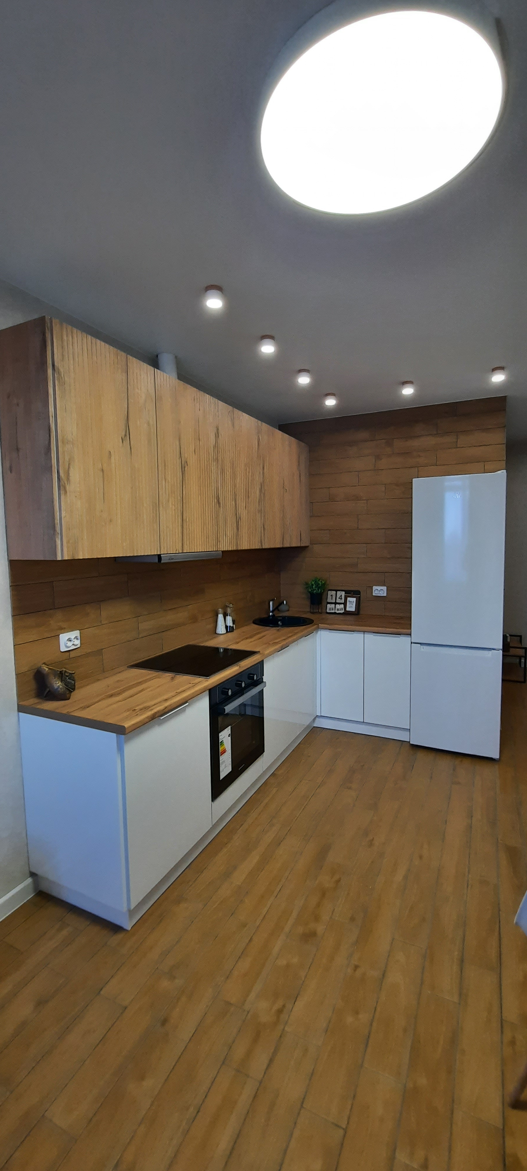 Кухонный гарнитур укомплектован: электрической варочной поверхностью, вытяжкой, высоким холодильником, духовым шкафом.