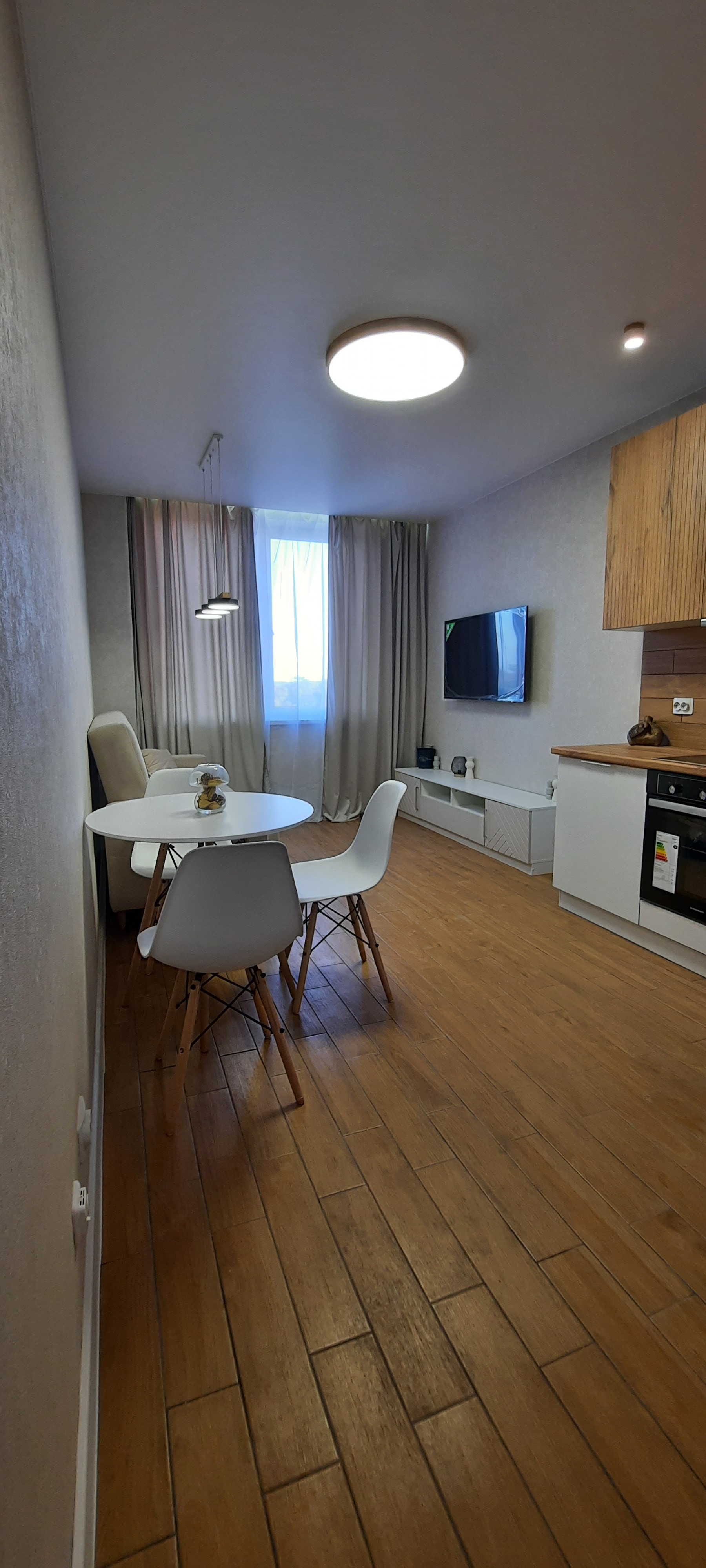 Просторная кухня-гостинная оформлена в скандинавском стиле, совмещает в себе стильный современный кухонный гарнитур, обеденную группу и зону отдыха с диваном, тумбой и телевизором.