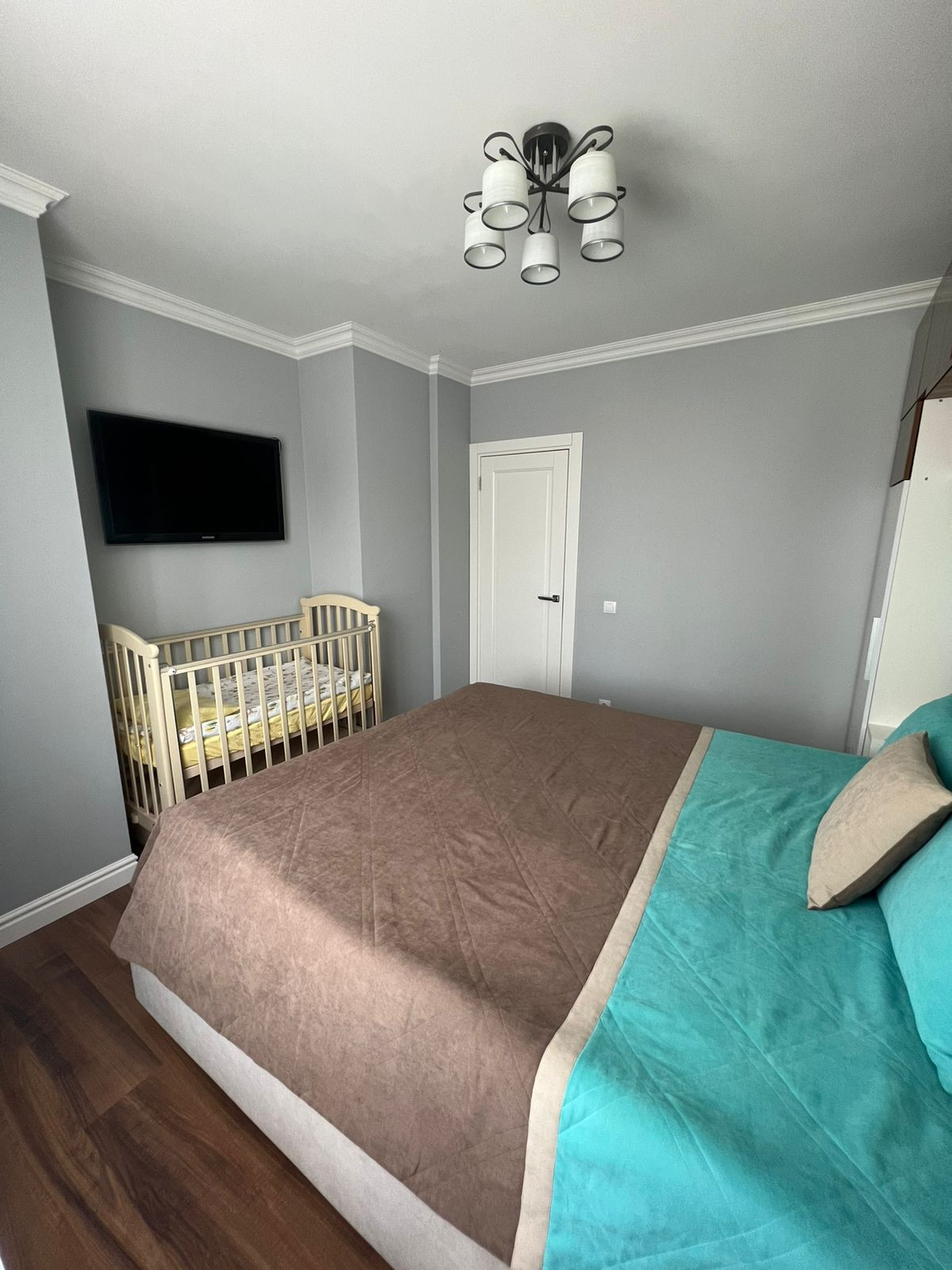 - Уютная мастер спальня для родителей или взрослых людей со стильным гарнитуром для хранения имущества;