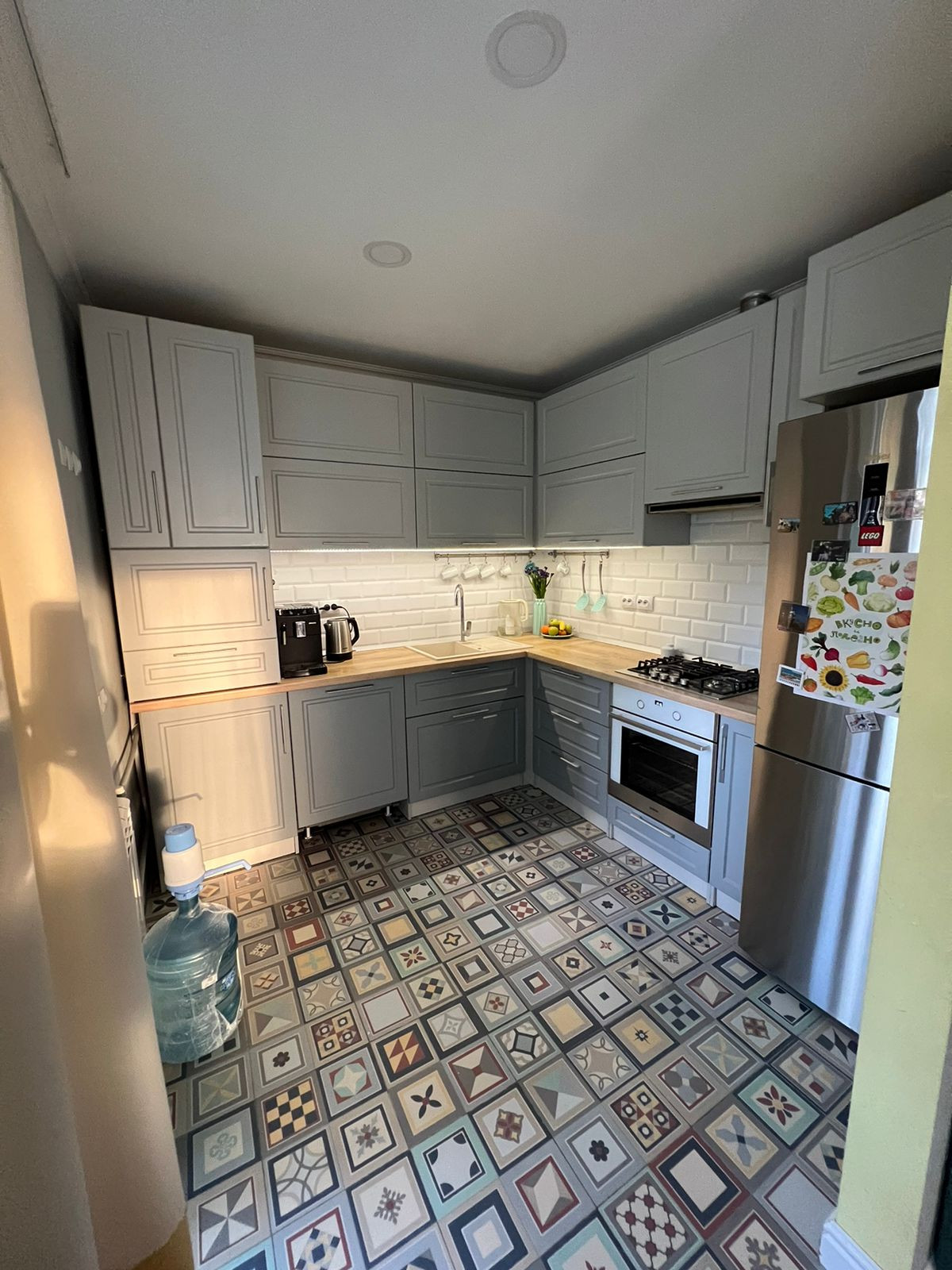 - Ремонт выполнен в стиле «современная классика». Такой интерьер нейтрален в восприятии и подходит для людей любого возраста. Переделывать, ломать и перекрашивать ничего не нужно. Стены выкрашены в светлые тона премиальной и экологичной краской «Sherwin-Williams». На полу ламинат «Haro» (Германия). В прихожей и на кухне акцентная плитка, которая подчеркивает индивидуальность жителей квартиры и вносит яркость в интерьер. Потолок выполнен из гипсокартона – данный материал был выбран в угоду экологичности, т.к в квартире живут дети;