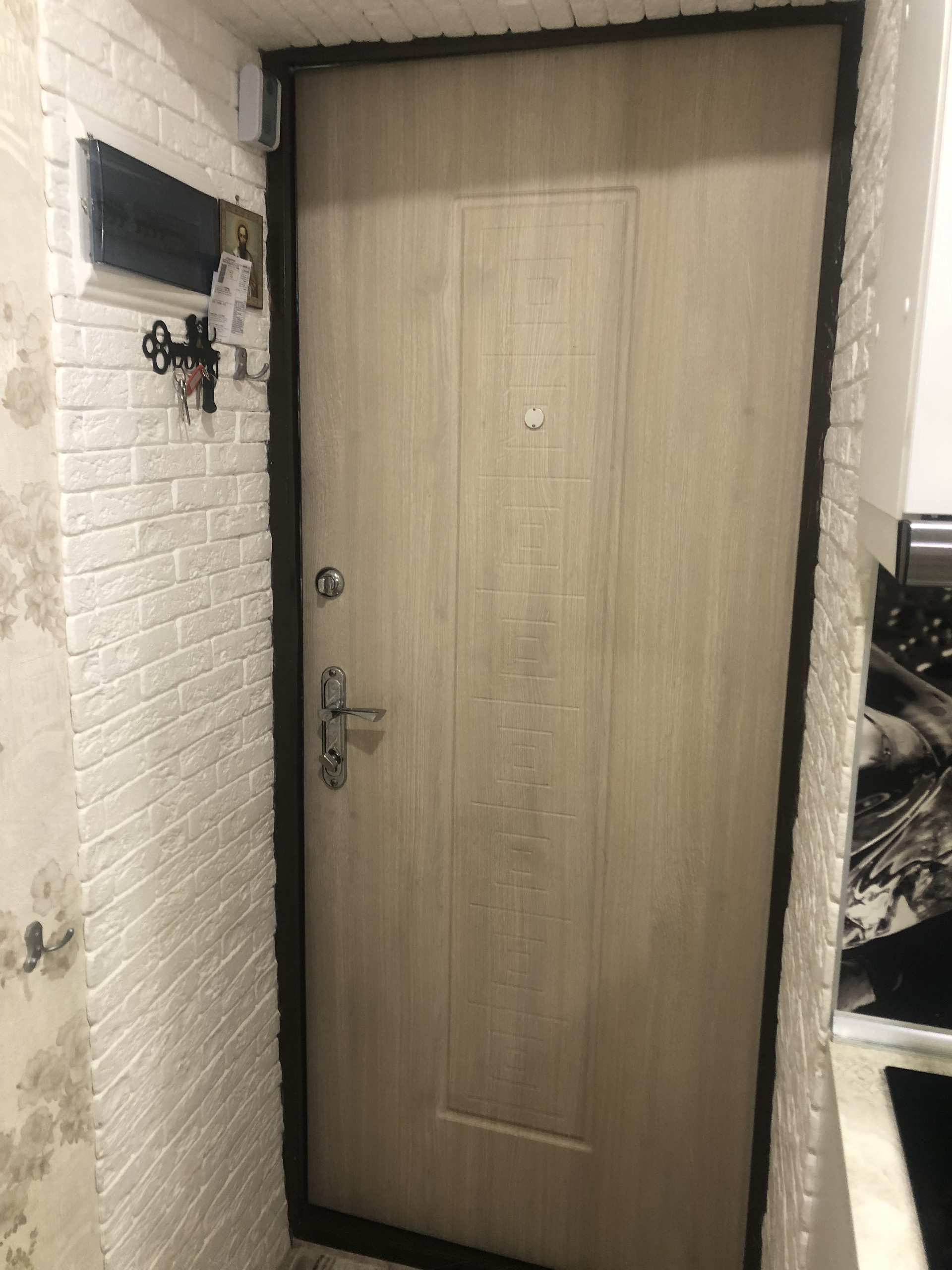Вся прихожая находится в тамбуре, очень удобно, демисезонная одежда и уличная обувь не занимают место в комнате.