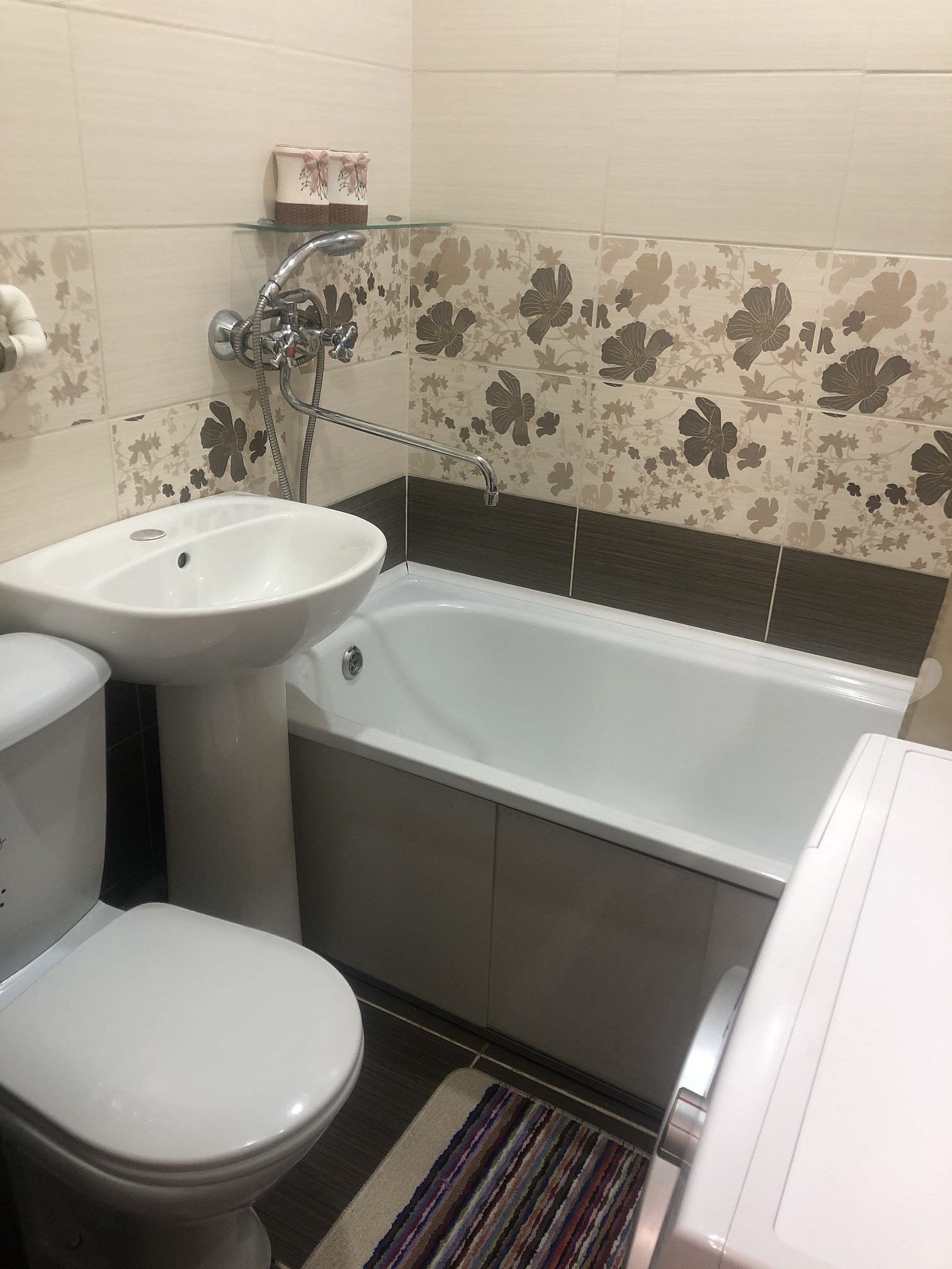 Санузел совмещенный в современном кафеле с декором, импортная сантехника, принудительная вентиляция. Натяжной потолок с точечными светильниками добавляют объема.