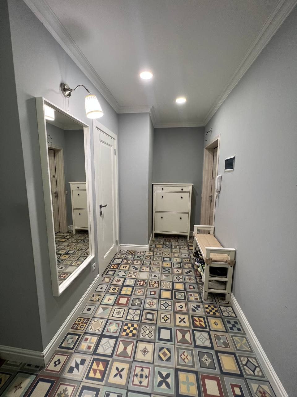 - Ремонт выполнен в стиле «современная классика». Такой интерьер нейтрален в восприятии и подходит для людей любого возраста. Переделывать, ломать и перекрашивать ничего не нужно. Стены выкрашены в светлые тона премиальной и экологичной краской «Sherwin-Williams». На полу ламинат «Haro» (Германия). В прихожей и на кухне акцентная плитка, которая подчеркивает индивидуальность жителей квартиры и вносит яркость в интерьер. Потолок выполнен из гипсокартона – данный материал был выбран в угоду экологичности, т.к в квартире живут дети;