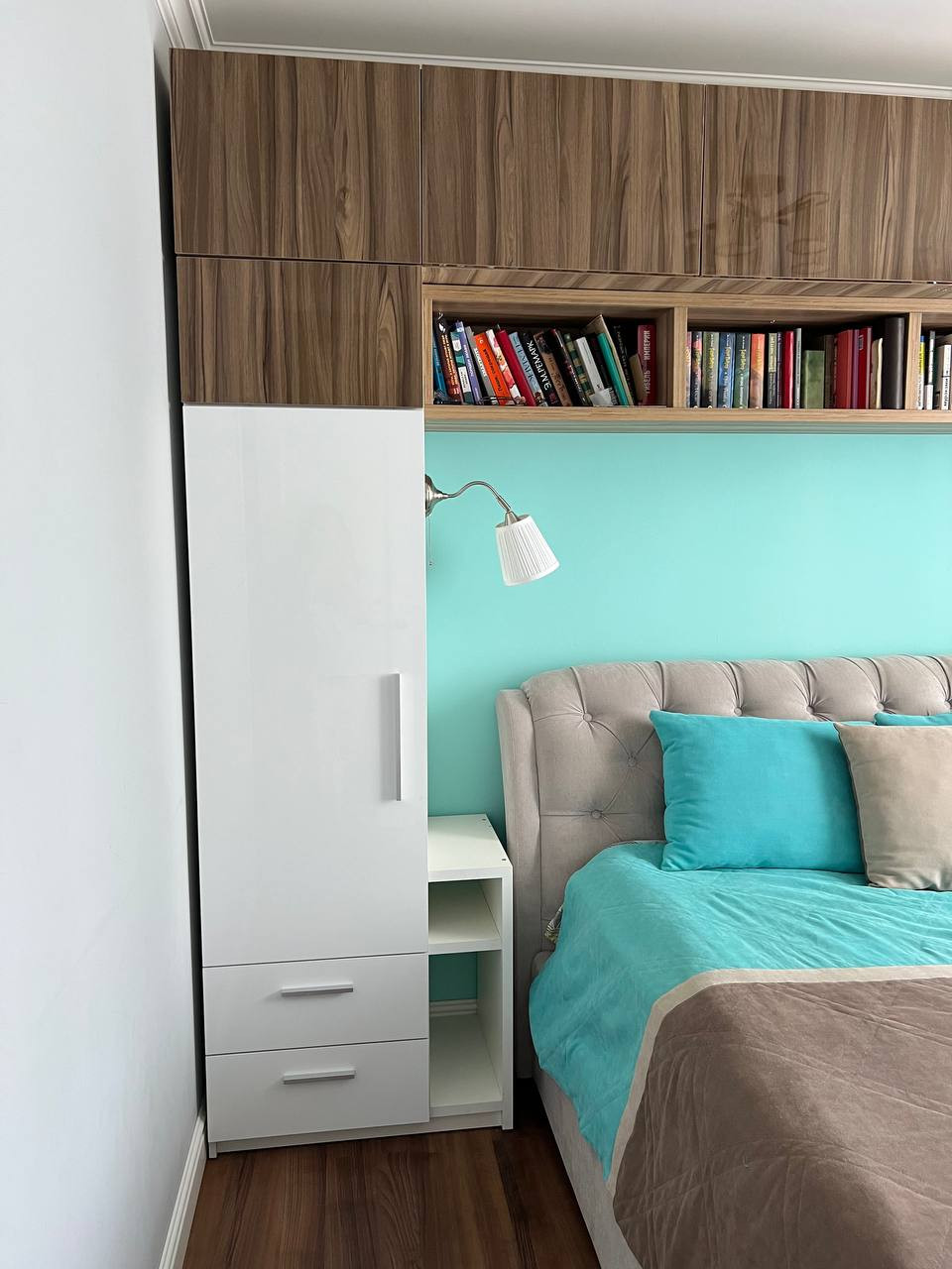 - Уютная мастер спальня для родителей или взрослых людей со стильным гарнитуром для хранения имущества;