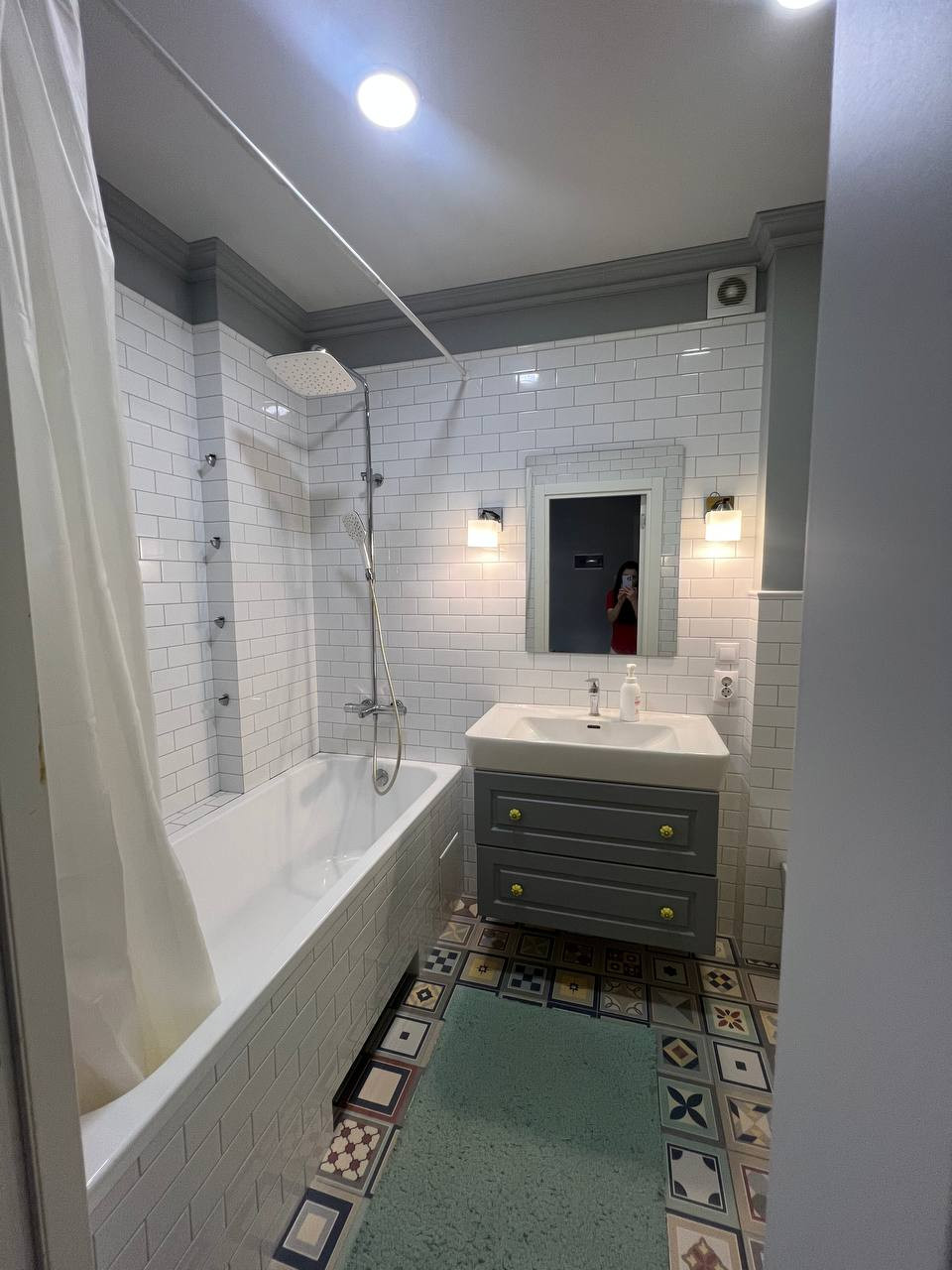 - Большая ванная комната с яркими акцентами в интерьере, сантехникой «Ravak» (Чехия) и «Roca» (Испания);