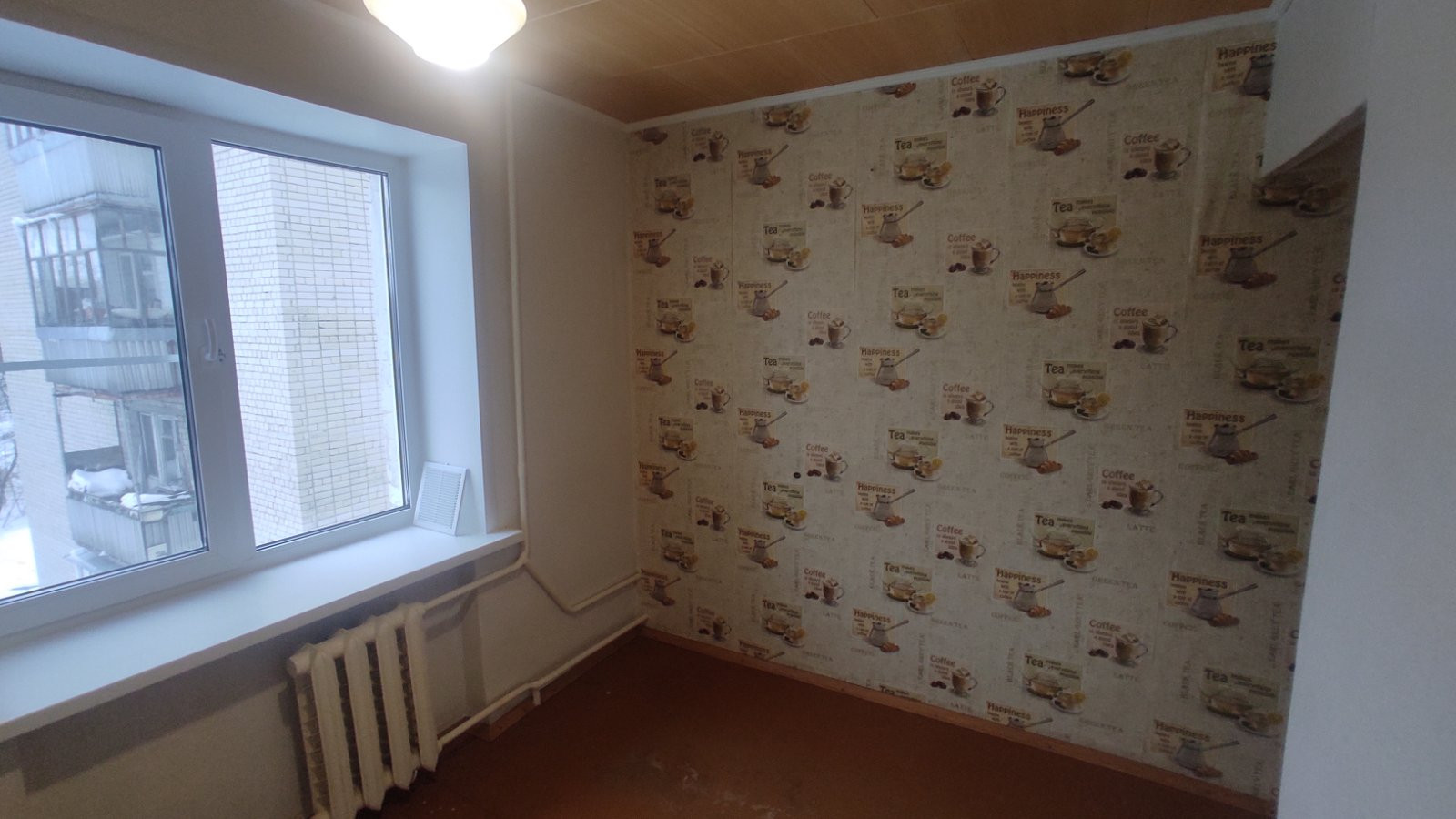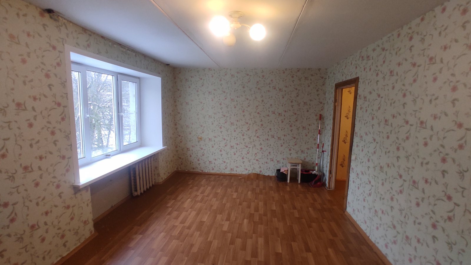 Установлены пласт. окна, пол стянут и закрыт ДСП, стены в целом ровные, необходимо лишь выбрать напольное покрытие и обои.