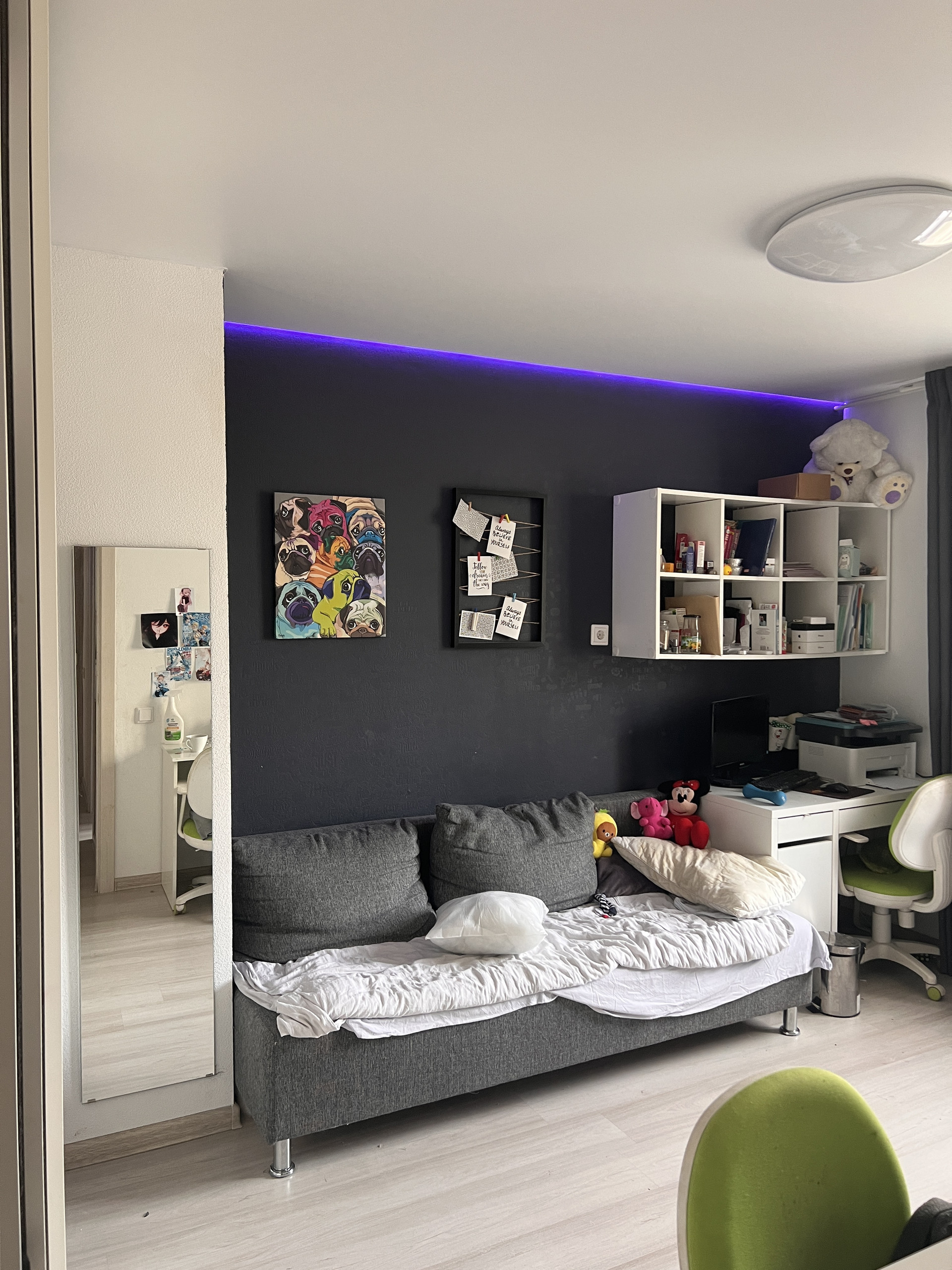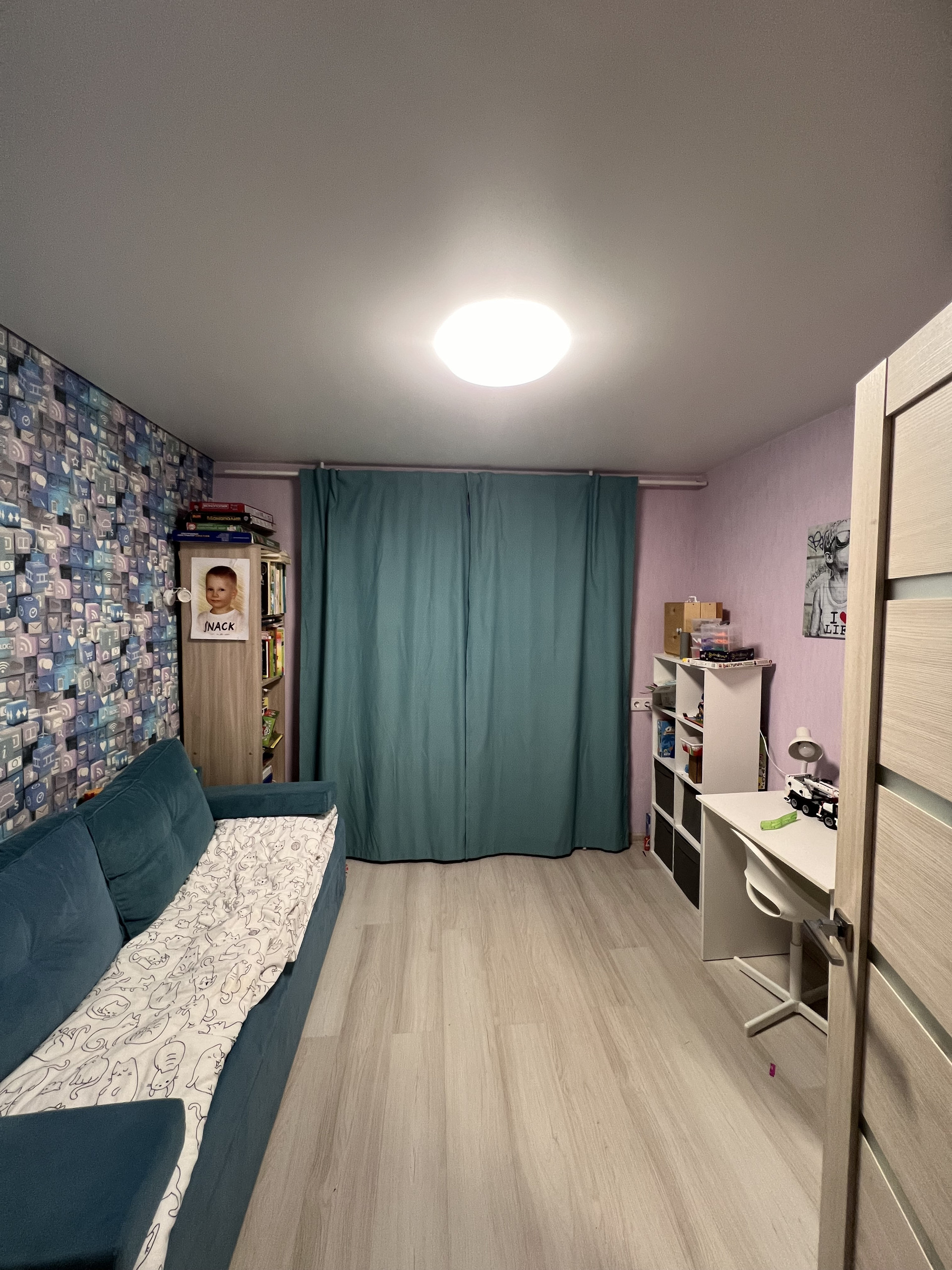 Одна из комнат выходит на балкон с панорамным остеклением (теплое остекление, 5-камерный профиль, 2-камерный стеклопакет).