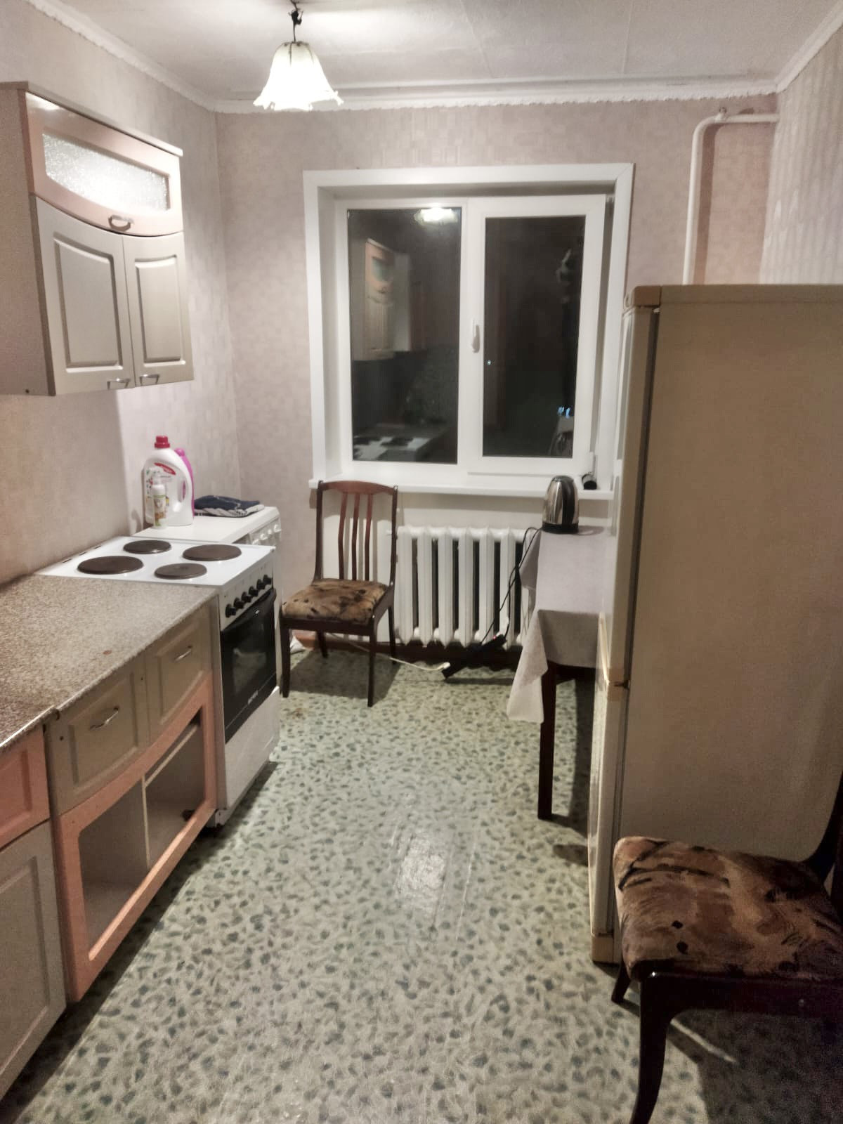 Готовы оставить мебель (при необходимости): кухонный гарнитур, обеденный и письменный стол, шкаф, тумбочка, диван, холодильник, стиральная машинка, стулья, ковролин.