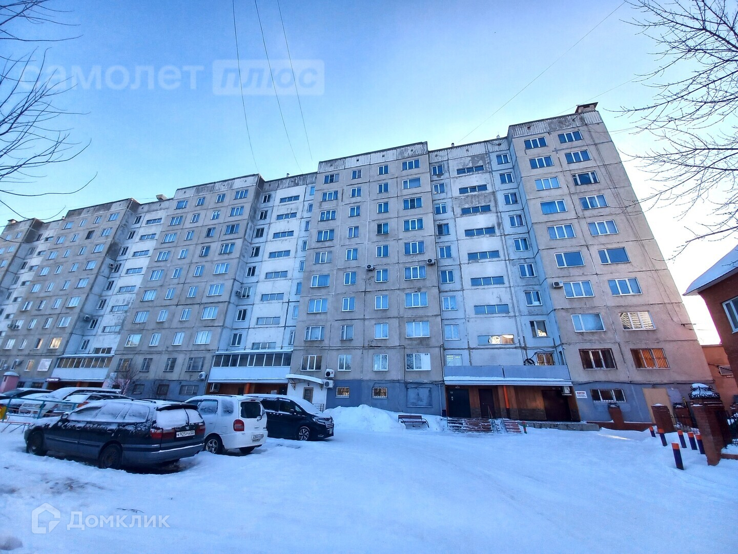 Окна выходят во двор, где находится парковка.