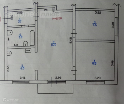 Площадь квартиры 47,9 кв.м. Комнаты смежные (16,9 кв.м., 7,6 кв.м., 9,9 кв.м.) Кухня 6,5 кв.м. Санузел совместный. Балкон не застеклен.